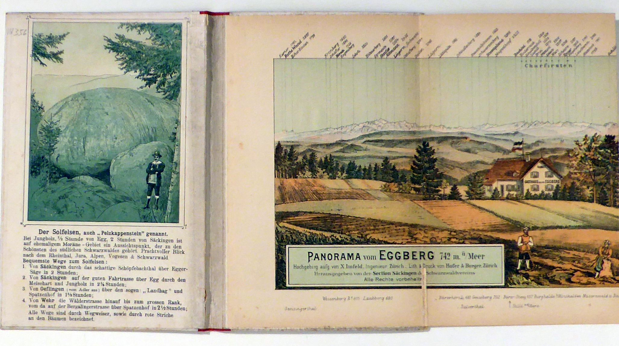 Hochgebirg aufg. von X[aver] Imfeld, Ingenieur, Zürich. Herausgegeben von der Section Säckingen des Schwarzwaldvereins. Bergbestimmungen im Jura von P. A. Streicher. Zch.: Hofer & Burger, [1892]. 1 Bl., mehrfach gefaltet, Einband: Klappenmappe, Original-Halbleinwand. Format: 277 x 21 cm (bxh); gefaltet 14 x 21.5 cm. Erstausgabe. Hauri (Hofer & Burger) 444. Koloriertes, lithographiertes Panorama. Es handelt sich dabei um die Original-Ausgabe von 1892. Umschlagtitel: Panorama vom Eggberg bei Säckingen. Aufgenommen am Rand des Meisehart, 742 m über Meer. Vignette von Säckingen auf Umschlag-Vorderdeckel, Abbildungen vom Bad-Hotel Säckingen sowie vom Gasthof zum Schützen auf Umschlag-Hinterdeckel. Gipfel mit Namen und Höhenangabe, Ortschaften mit Namen und teilweise mit Höhenangabe