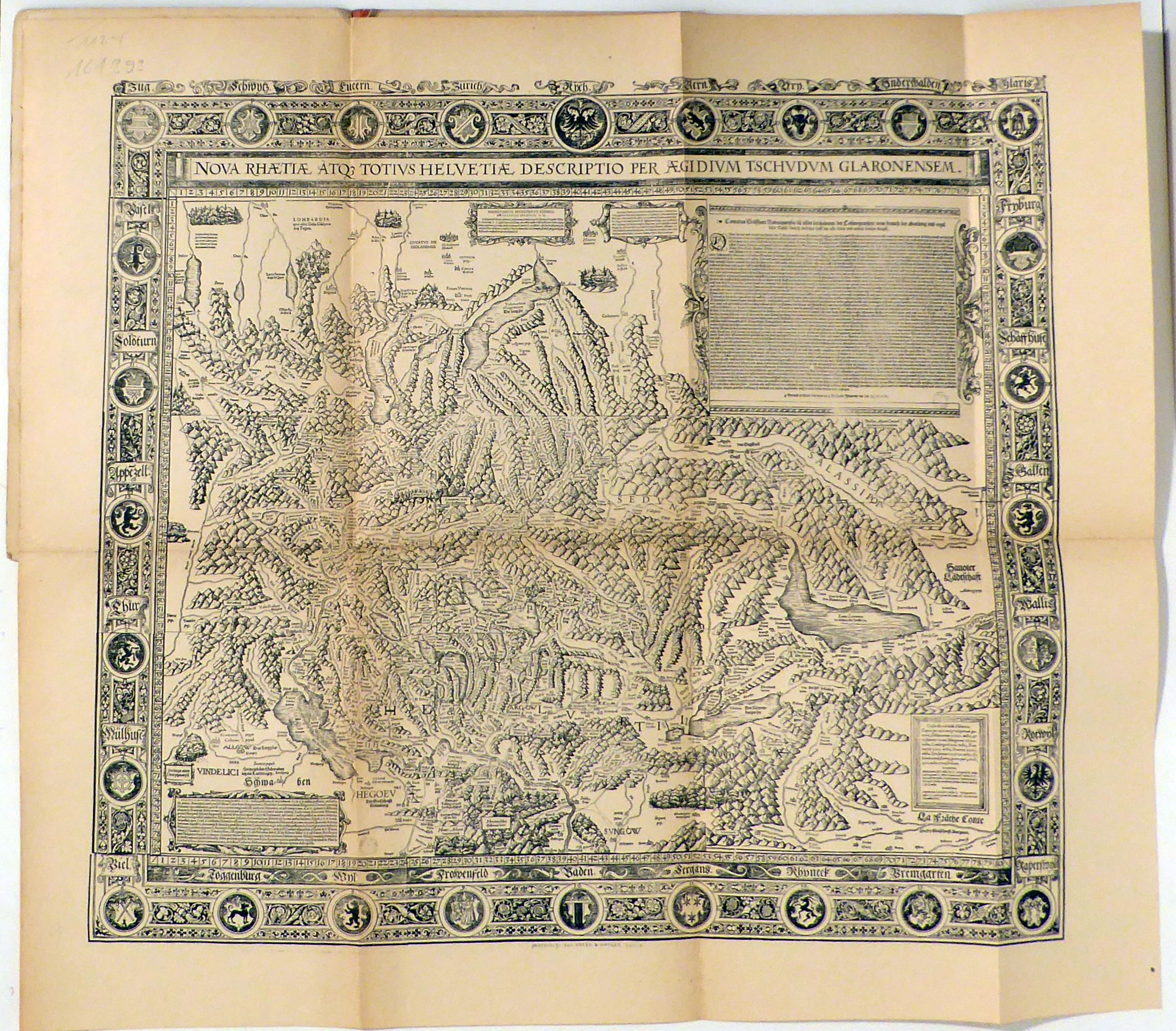 Erstausgabe. Blumer, 36, Nr. 16. - Nicht bei Hauri (Hofer & Burger). Landkarte in Faksimile von Aegidius Tschudi, In der Randzeichnung Wappen verschiedener Schweizer Städte und Landschaften sowie der zugewandten Orte Mülhausen im Elsass und Rottweil