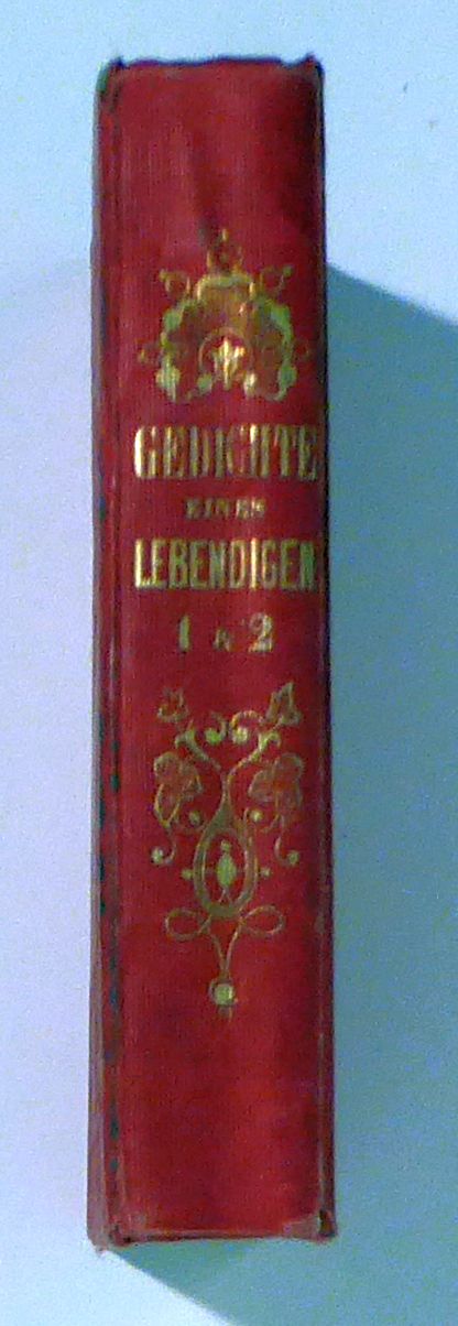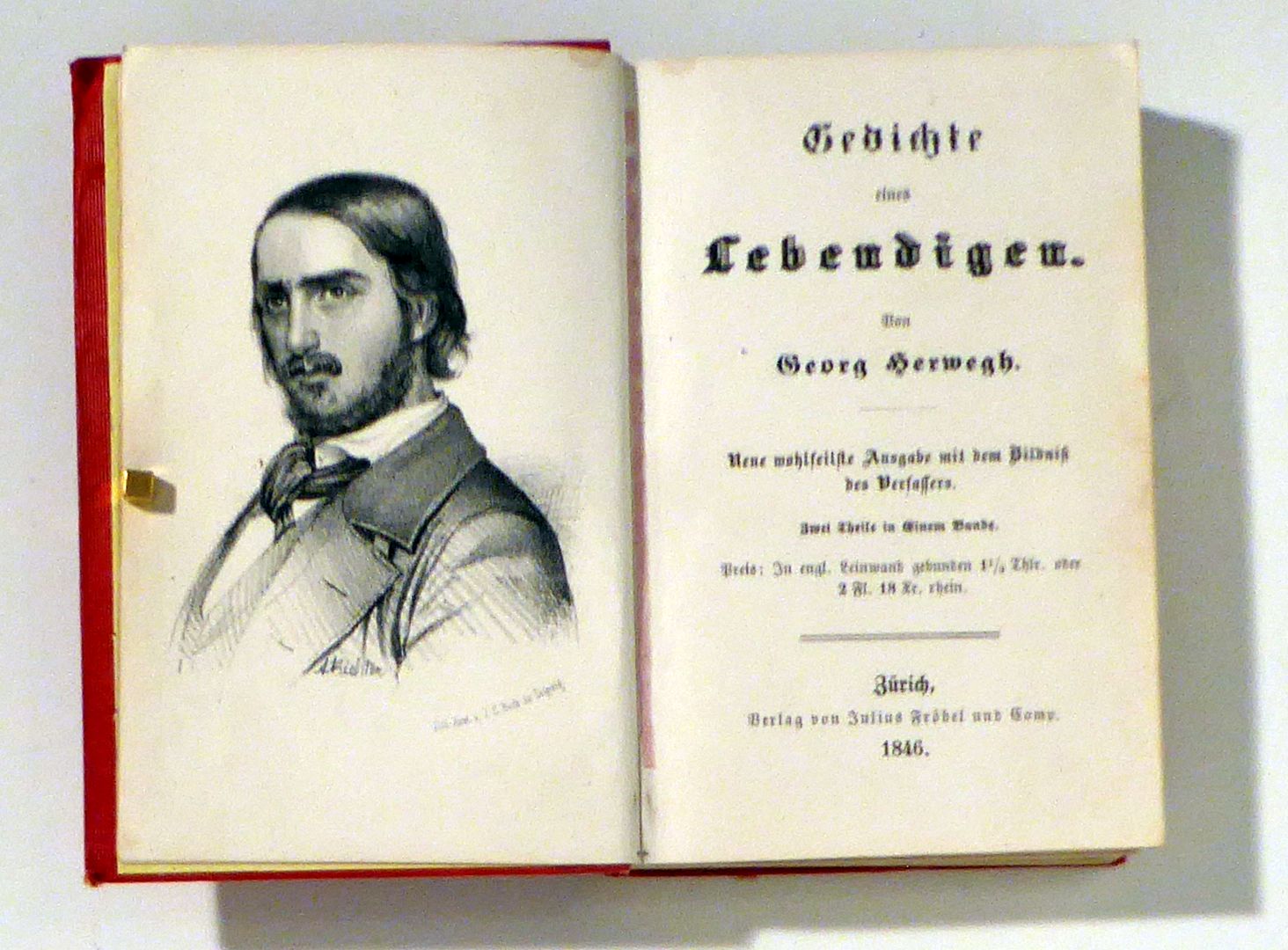Neue wohlfeilste Ausgabe mit dem Bildniß des Verfassers. Zwei Theile in Einem Band. Zch.: Julius Fröbel und Comp., 1846. 2 Bde. in einem, 168, 194 S., Einband: roter Pbd. mit Blindprägung und gold. Rückenverzierung. Format: kl.8°. Mit einem lithographierten Porträt des Dichters von A[dolf] [Heinrich] Richter, gedruckt in Fraktur