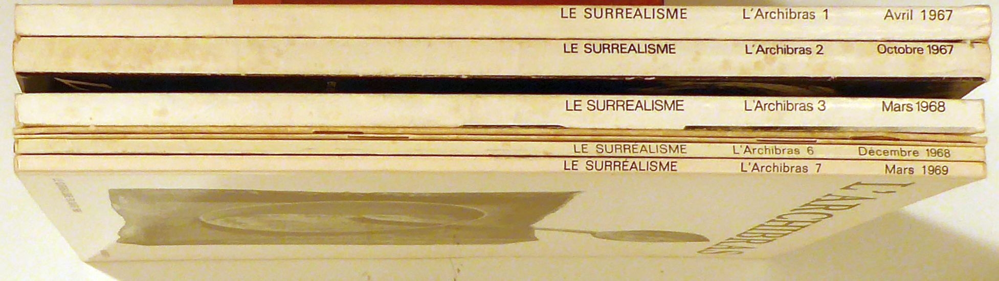 Le surréalisme. Paris: Terrain vague, 1967-1969. 7 Hefte, mit zahlreichen s/w-Abbildungen nach Fotografien und von Dokumenten sowie von Zeichnungen. Einband: Or.br. Format: 4°. Reihe: L'archibras, vol 1-7.