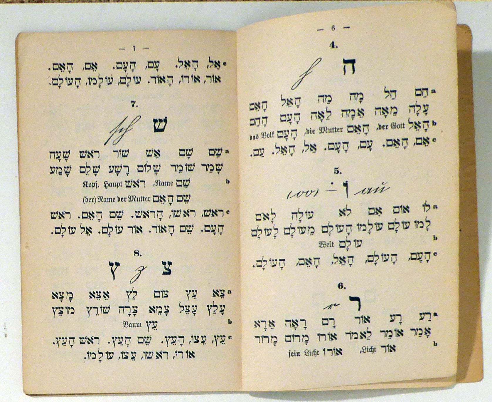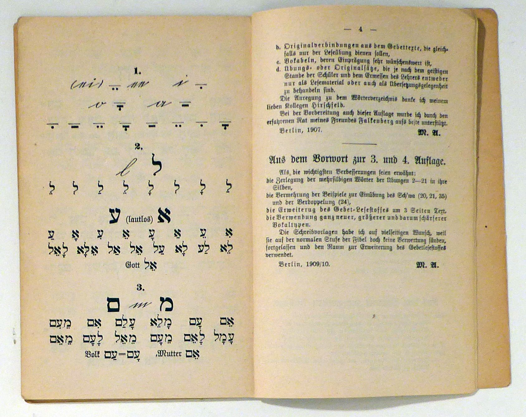 Zugleich eine Vorstufe zur Tefilla kezara. sechste verbesserte Auflage. Ffm.: Kauffmann, 1916. 39, [1] S., Einband: Original-Halbleinwand. Format: kl.8°. 58 Lesestücke und eine Alphabetstafel für allgemeine und religiöse Texte. Die Texte sind vokalisiert, die Buchstaben werden einzeln auch in einer Schreibschrift dargestellt, gedruckt in Fraktur