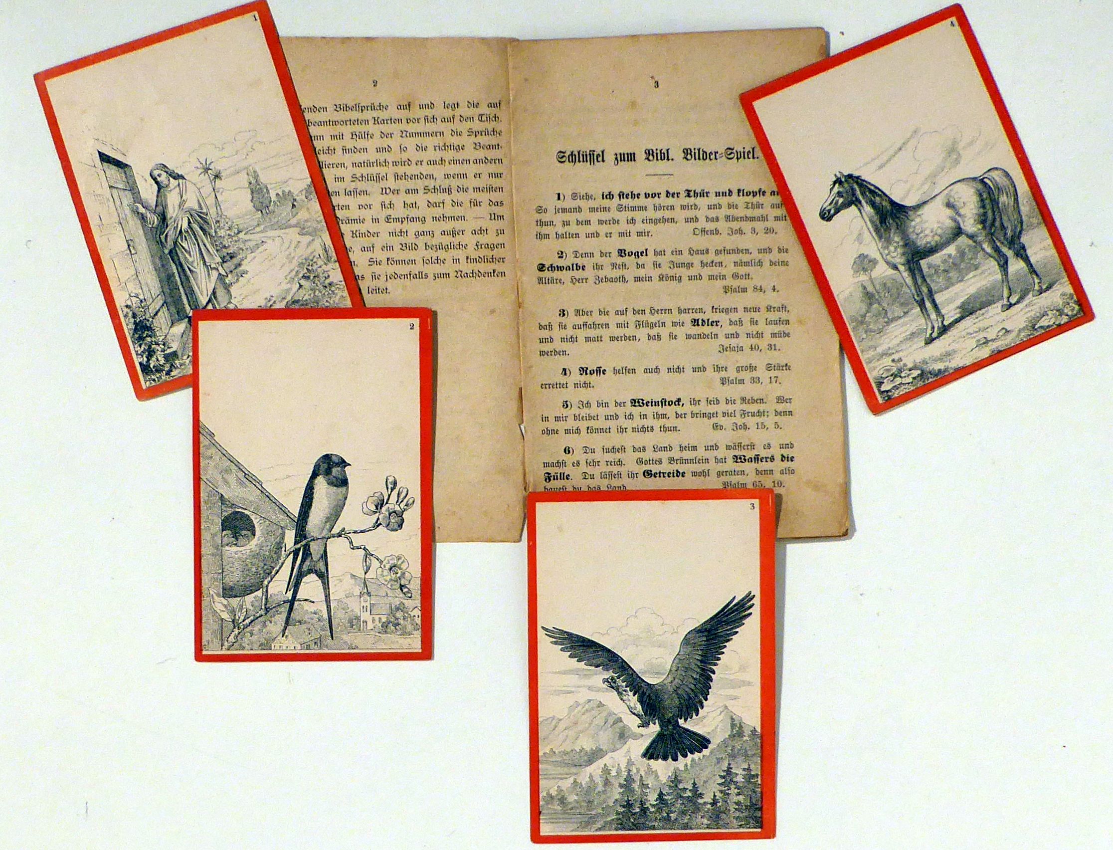 Basel: C. F. Spittler, um 1830. 16 S., 60 Bl., Einband: Original kartoniert. Format: kl.8°. 60 Spielkarten aus Papier, 8x11 cm, mit einer s/w Illustration zu einer Bibelstelle, dazu Broschüre von 16 Seiten mit Spielanleitung und den Bibelstellen zu den Karten in einer Kartonmappe mit gepräter Verzierung und Titel, gedruckt in Fraktur