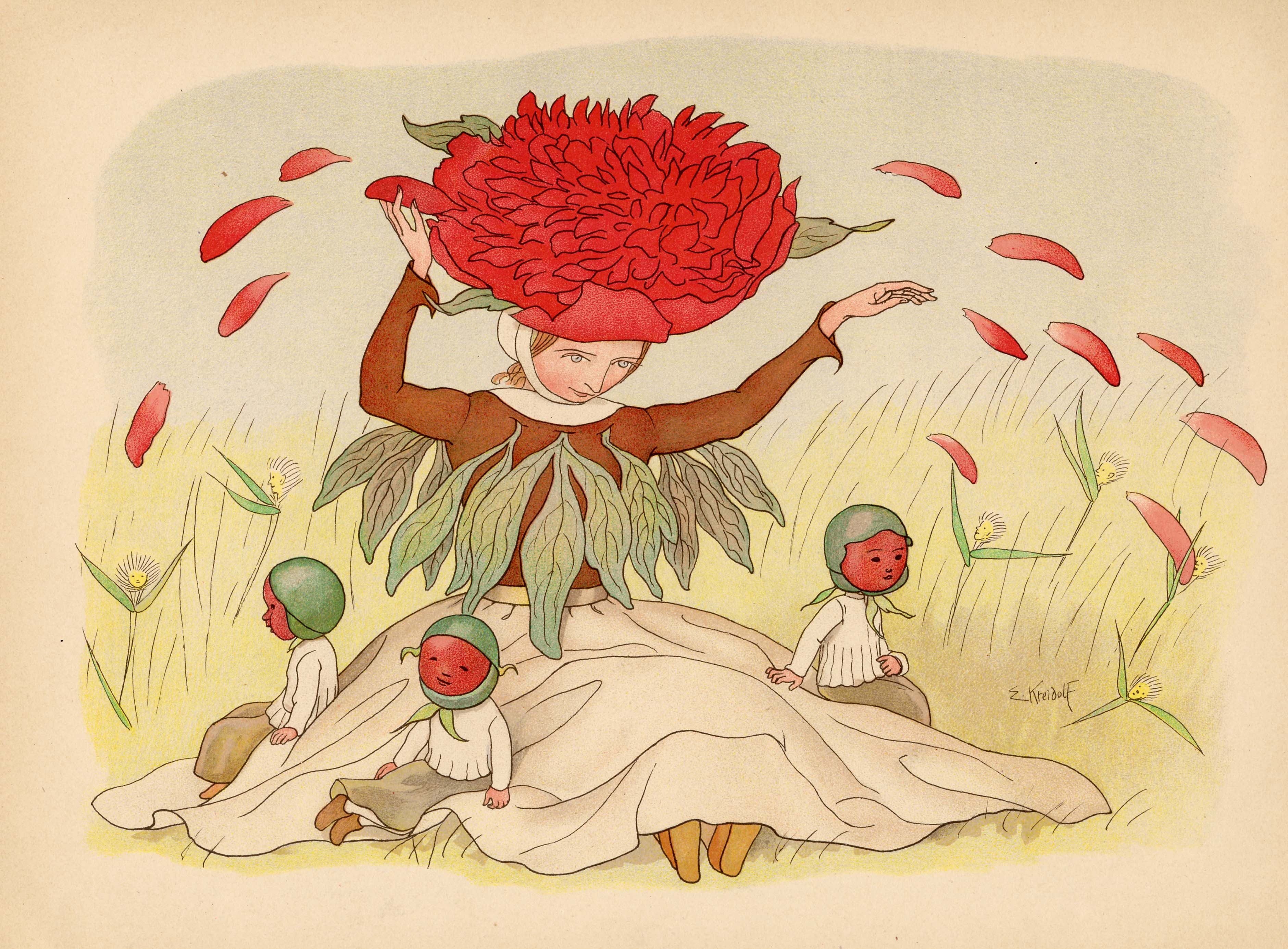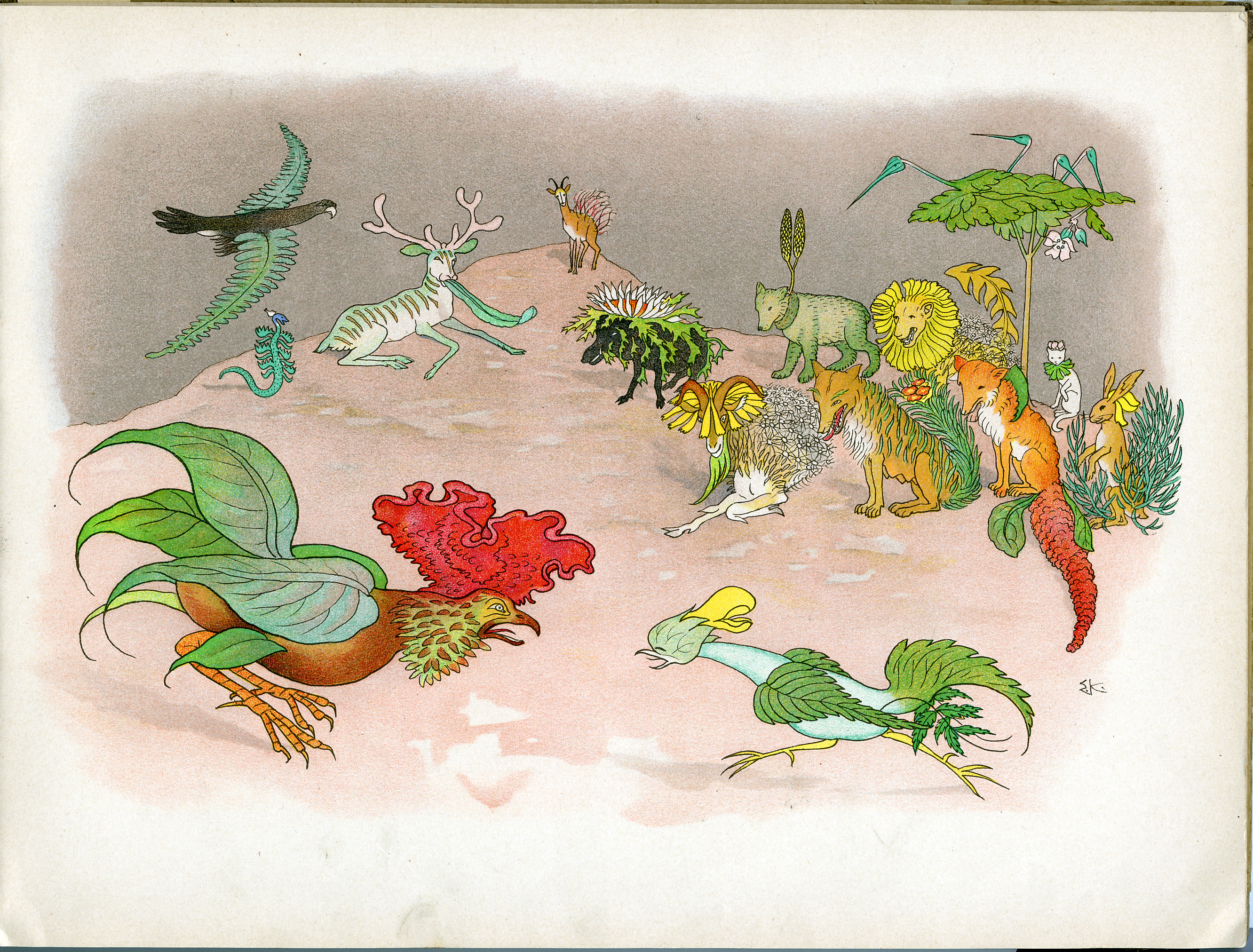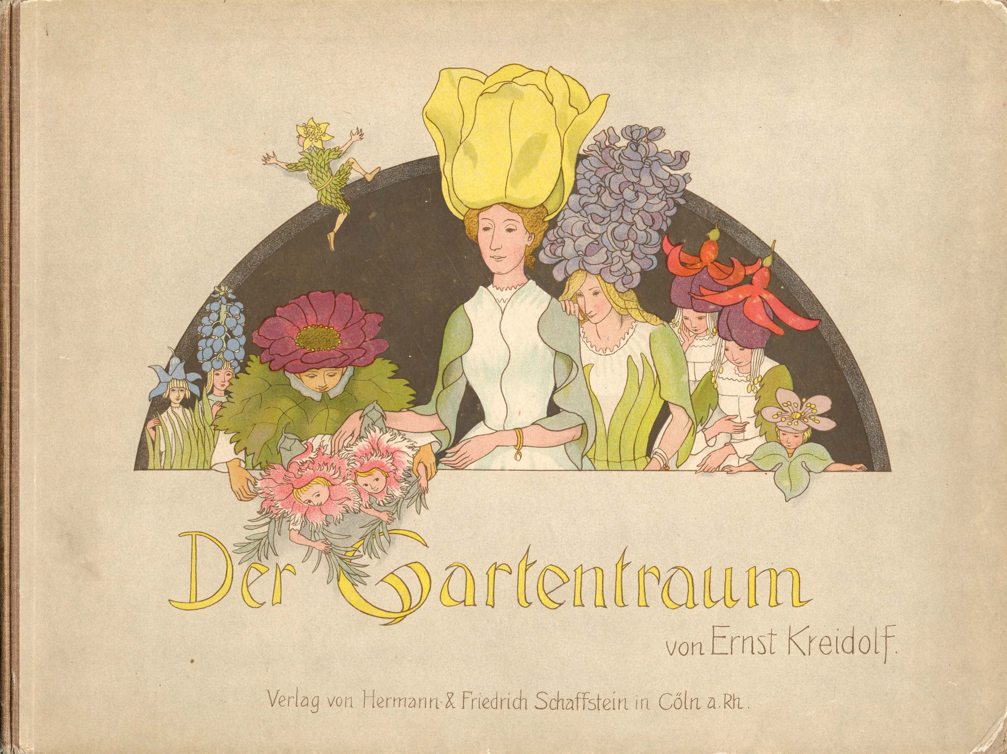 Neue Blumenmärchen. 2. Auflage. Köln: Verlag von Hermann Schaffstein, [1923]. [34] S., mit 16 chromolithographierten Farbtafeln. Einband: farbig illustr. Or.Hln. mit verstärkten Ecken. Format: gr.8°, quer. Hess, Wachter A6. Das vorliegende Exemplar ist, anders als bei Hesse, Wachter angegeben, drahtgeheftet
