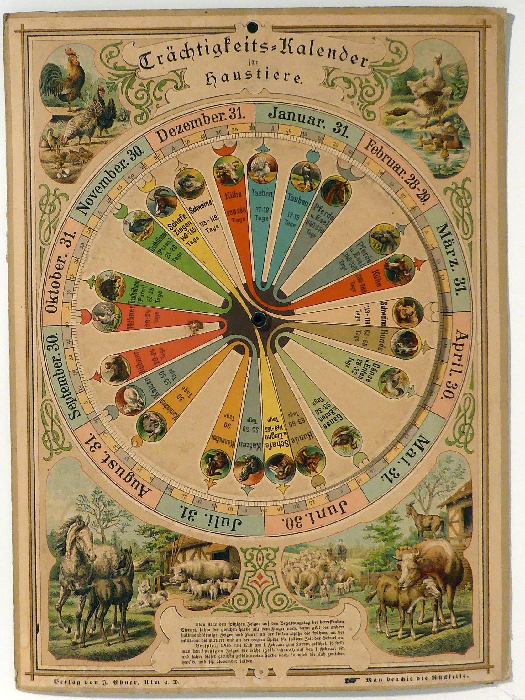 Ulm: J. Ebner, um 1900. Einband: ohne Einband. Format: 32x44 cm (bxh). Kartontafel mit Drehscheibe. Benutzbar für Enten, Esel, Gänse, Hunde, Kaninchen, Katzen, Kühe, Pferde, Schafe, Schweine, Tauben, Truten und Ziegen. Auf der Tafel ist das Kalendarium abgebildet, auf der Drehscheibe die Tiere. Mit dem Zeiger wird der Parungsdatum eingestellt und damit auch der Geburtstermin angezeigt. Gedruckt in Chromolithographie. Auf der Rückseite Werbung für weitere Verlagserzeugnisse, gedruckt in Fraktur