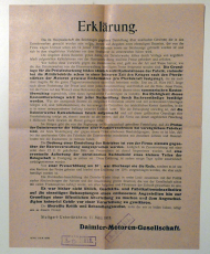 Die im Hauptausschuss des Reichstages gegebene Darstellung über unerlaubte Gewinne, die in den Daimlerwerken gemacht worden sein sollen, beruht auf Angaben eines ehemaligen Beamten, der von der Firma wegen Untreue schon am 12. Januar 1918 entlassen s. Stuttgart-Untertürkheim: Daimler-Motoren-Gesellschaft, 1918. 1 Bl., Einband: Einblatt. Format: 4°. Daimler-Benz wehrt sich in der Erklärung gegen die Beschuldigung, sich mit Preismanipulationen und Drohungen, den Betrieb stillzulegen, kriegswirtschaftliche Vorteile erschlichen zu haben. Druckvermerk 18/442. 12.3.18, 15.000. Mit dem Ausfuhrzeichen des XIII. Armeekorps (Stuttgart)
