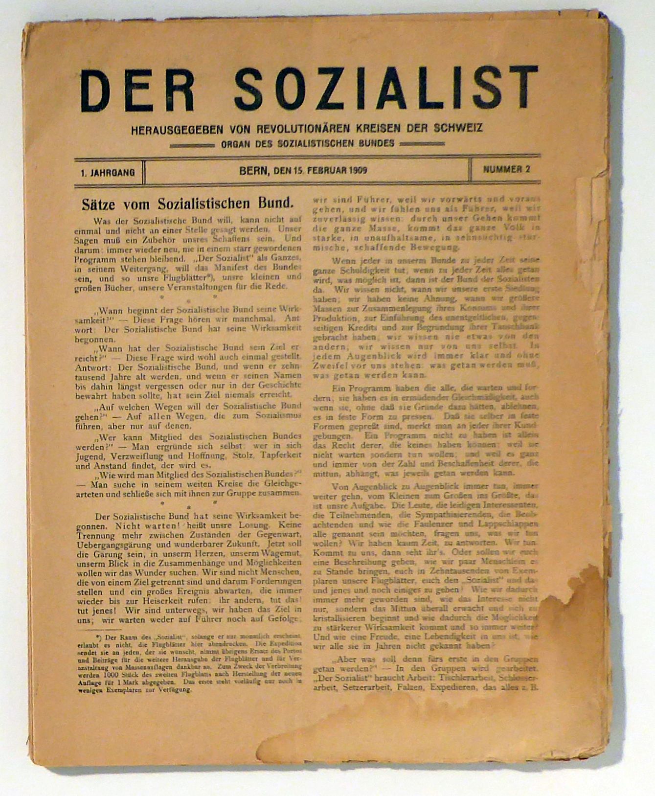 Organ des Sozialistischen Bundes. Bern: Sozialistischer Bund, 1909. 15 Hefte, je 8 S., Einband: Zweimal auf Grösse 29,5x23 cm gefaltete Blätter. Format: 4°. Reihe: Der Sozialist,1. Jahrgang, Nr. 1-9, 11-21.
