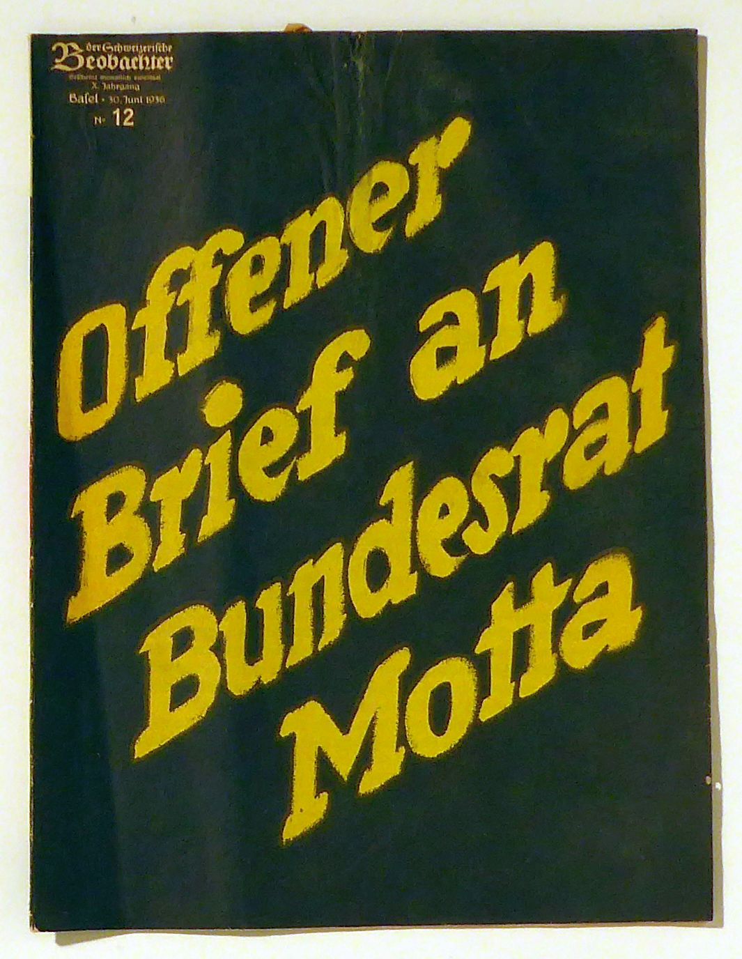 In einem offenen Brief an Bundesrat Motta plädiert der Herausgeben Max Ras für einen überstaatlichen Völkerbund, der imstande sein könnte, Völkerrechtsverletzungen zu ahnden. Auf dem Hintergrund der Angriffe Italiens auf Abessinien und Japans auf China schreibt er: "Die Welt steht heute am Vorabend eines Krieges von unerhörtem Ausmass. Keine Phantasie reicht aus, die Schrecknisse auszumalen, die bei den kriegstechnischen Fortschritten für Armeen und die Zivilbevölkerung eintreten werden.", gedruckt in Fraktur