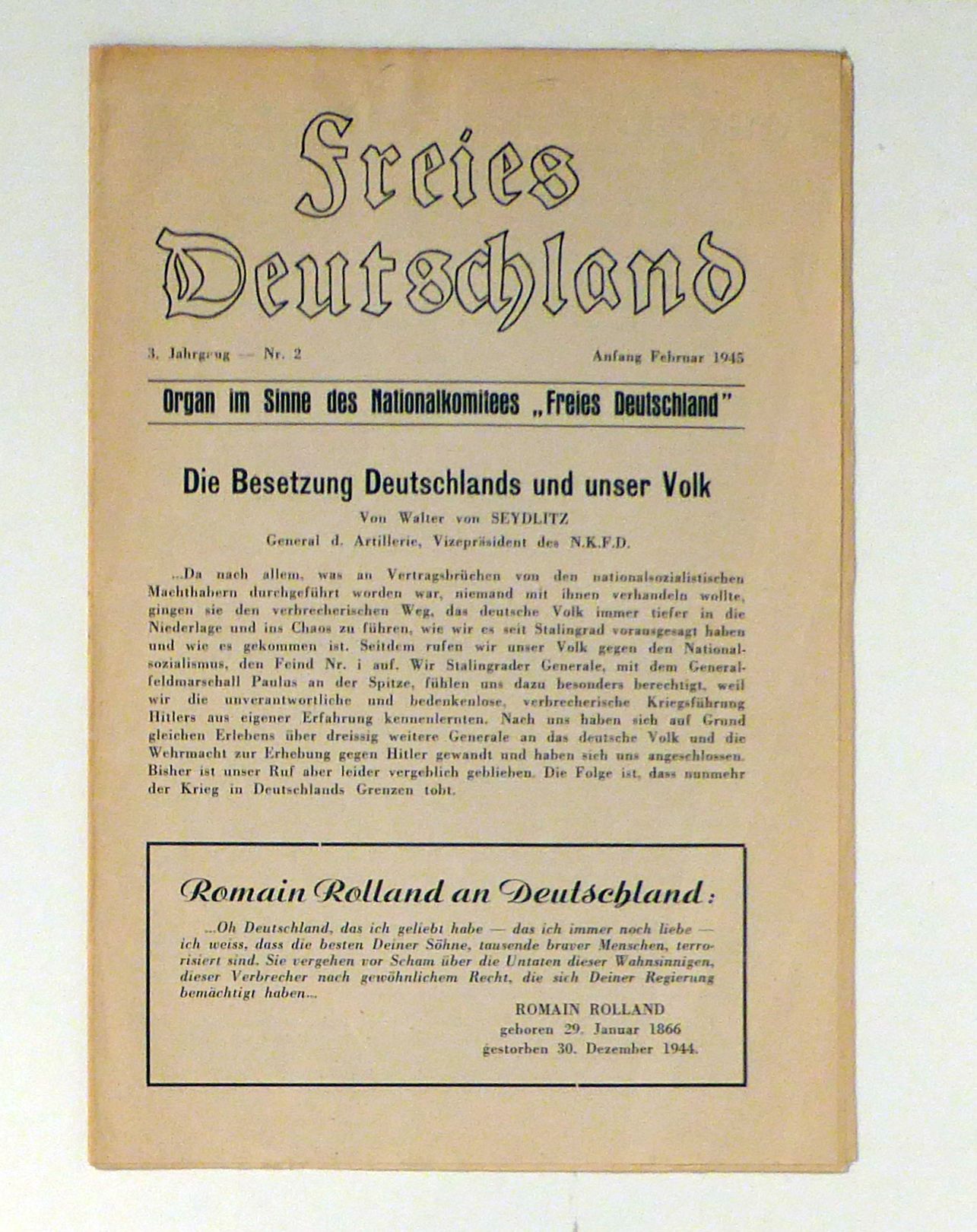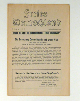 Organ im Sinne des Nationalkomitees "Freies Deutschland". [Zch.]: s. n., 1945. 2 Nummern, je 16 S., Einband: lose Bogen. Format: gr.8°. Reihe: Freies Deutschland, III. Jahrgang, Nr. 2, Anfang Februar, und Nr. 3, Anfang März 1945.