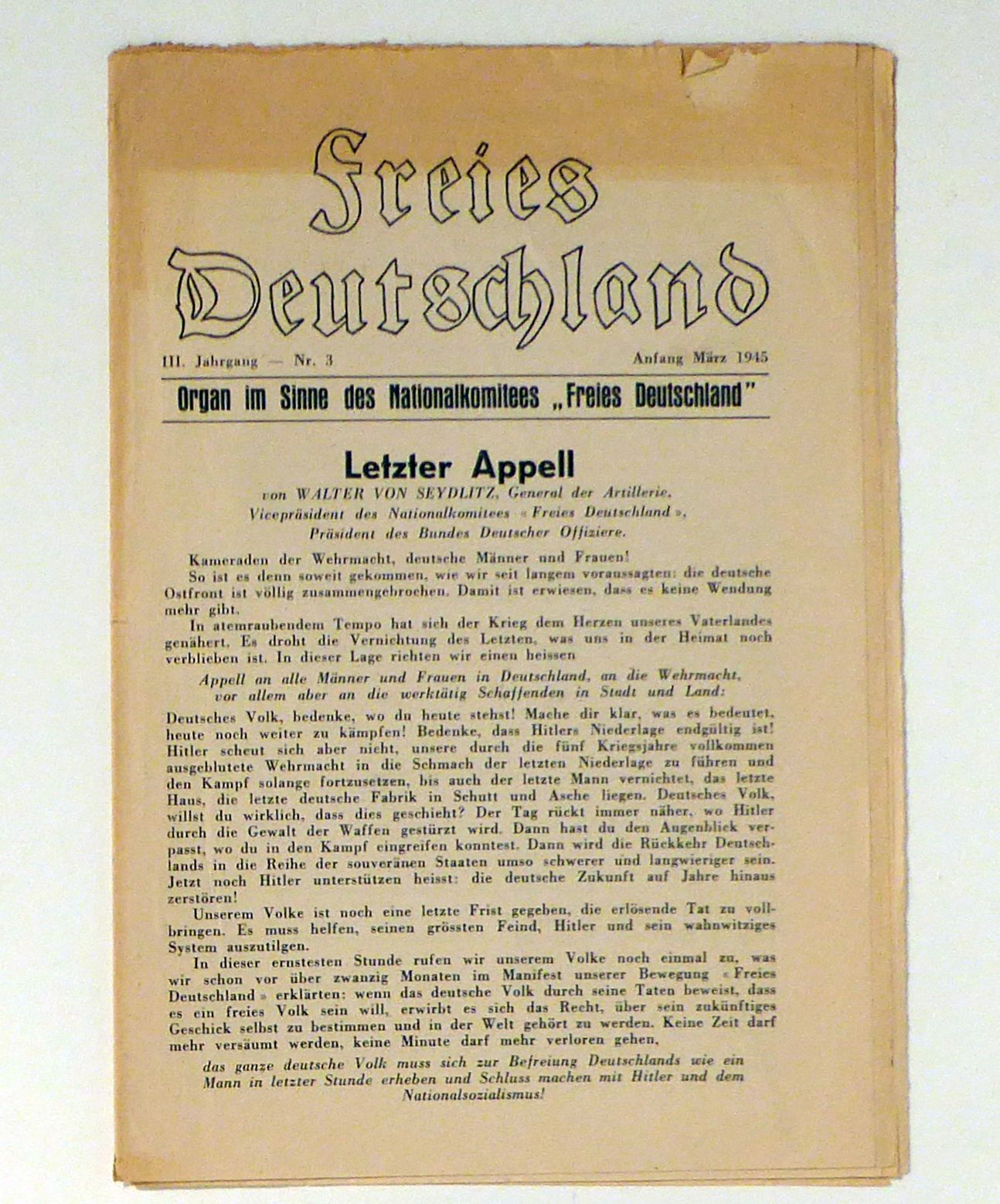 Herausgegeben von der Bewegung Freies Deutschland in der Schweiz. Noch illegal erschienen, da Emigranten politische Aktivitäten untersagt waren. Die Bewegung "Freies Deutschland in der Schweiz" wurde erst im März 1945 offiziell zugelassen. Leitartikel von Walter von Seydlitz: "Die Besetzung Deutschlads und unser Volk" (Nr. 2) und "Letzter Appell" (Nr. 3)