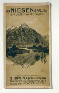 Aufgenommen & graviert von S[imon] Simon, Ingenieur-Topograph. Druck, Schrift und Farbgebung Bern: Kunstanstalt Hubacher & Co. A.-G. Bern: Hubacher, [1910]. 1 Bl., mit einem mehrfarbigen Panorama vom Suggihorn bis Regenholshorn. Format: 172 x 22 cm (bxh); gefaltet 12.5 x 22 cm. Titel auf Deckblatt: "Der Niesen (2367 mü/M) und die Berner Hochalpen". Sehr schön gestaltetes Panorama in frühem Jugendstil. Auf der Kopfleiste Gipfelnamen mit Höhenangabe. Kommerzielle Ausgabe der Beilage des SAC Jahrbuch 1909/10, 45. Jarhrgang (Hauri p 164)]