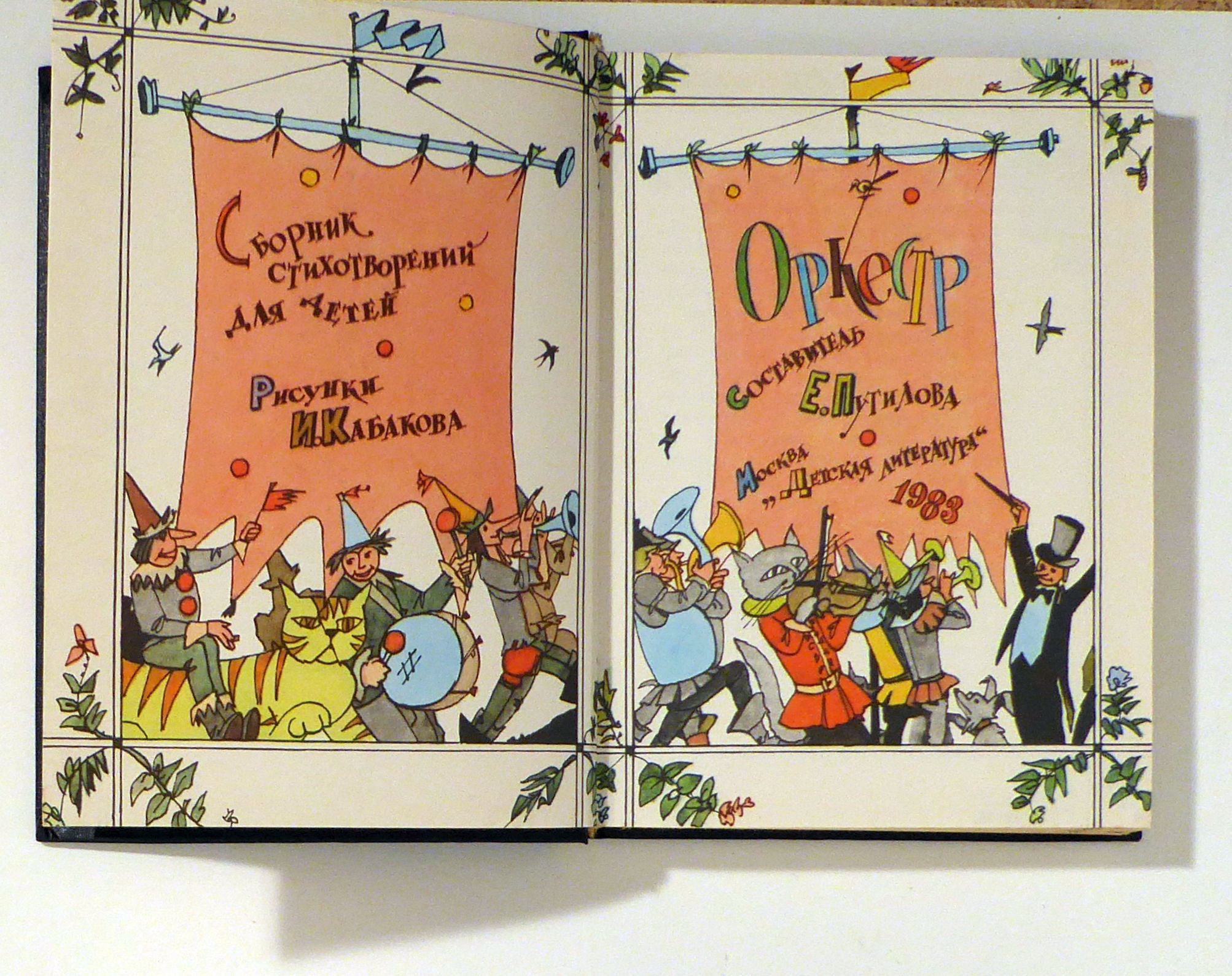 Сборник стихотворений для детей. Составитель Е. Путилова; Рисунки И. Кабакова. Москва: Детская Литература, 1983. 228, [12] S., mit zahlreichen, zum Teil ganzseitigen farbigen Illustrationen. Einband: Original-Leinwand. Format: 8°. Eine bemerkenswerte Sammlung von Gedichten für Kinder, mit Texten von Aleksandr Blok, Sasa Cernyj, Anna Achmatova, Boris Pasternak, Osip Mandelstam, Aleksandr Vvedenskij und anderen, reich illustriert von Ilja Kabakov