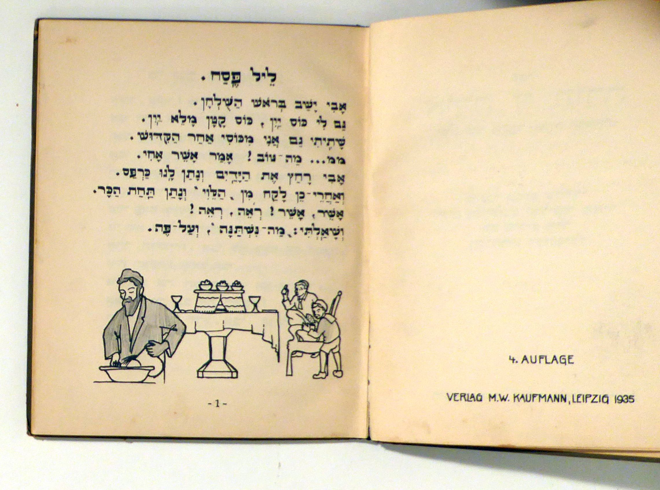 Zustand: Einband berieben und an den Kanten bestossen, im Gelenk gelockert. Deckel etwas aufgeworfen und mit kaum sichtbaren Feuchtigkeitsrand. Vorsätze etwas verblichen, vorne mit kleinem Einriss. Auf einigen Seiten wurden zu den hebräischen Texten mit Bleistift in Schreibschrift deutsche Übersetzungen geschrieben; die Illustrationen sind teilweise mit Bleistift ziemlich sorgfältig ausgemalt.Auf dem Innendeckel Namenseintrag mit Bleistift.