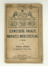 1:125.000. Wien: Artaria & Comp., [1881]. 1 Bl., Format: 67 x 53 cm (bxh); gefaltet 11 x 18 cm. Farbige Karte des Schneeberggebietes in Niederösterreich. Nebst Fahrstrassen und Eisenbahnlinien sind auch Alphütten und Triangulationspunkte eingezeichnet. Herausgegeben von Julius Albach, k.k. Hauptmann im Genie-Stab