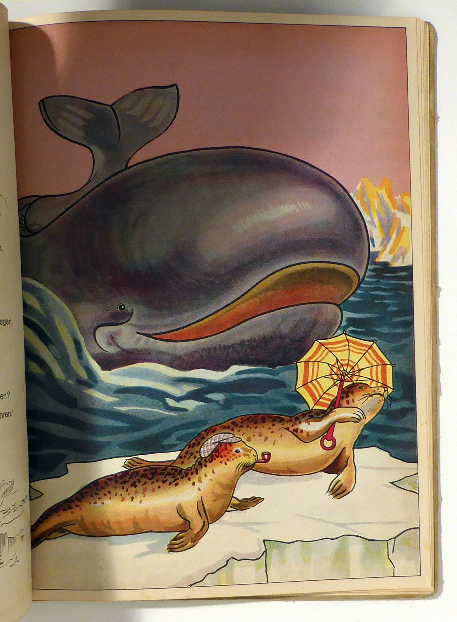 Ein Bilderbuch für grosse und kleine Kinder. Dem Führer des Luftschiffes "Graf Zeppelin" Dr. Dr. ing. e. h. Hugo Eckener und seinen wackeren Begleitern in Erinnerung an die erfolgreiche Arktisfahrt gewidmet. Leipzig: Edwin Freyer, [1932]. [32] S., mit 15 mehrfarbigen ganzseitigen Tefeln und 15 Textseiten mit s/w-Illustrationen. Einband: Original-Halbleinwand mit Deckelillustration. Format: 4°. Erstausgabe. Die Geschichte der Begegnung der Familie Eisbär mit dem Zeppelin auf Polarfahrt. Ausserst selten