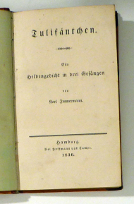 Ein Heldengedicht in drei Gesängen. Hamburg: Hoffmann und Campe, 1830. 144 S., Einband: Halbleder mit goldgeprägtem Rücken. Format: kl.8°. Erstausgabe. Borst 1611. - Brieger 1268. - Wilpert/Gühring2, 22, gedruckt in Fraktur