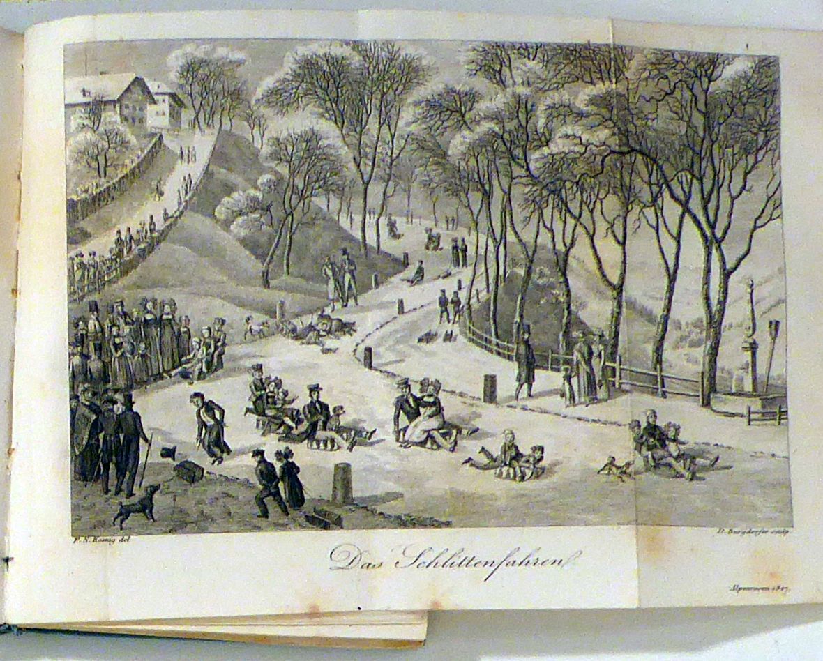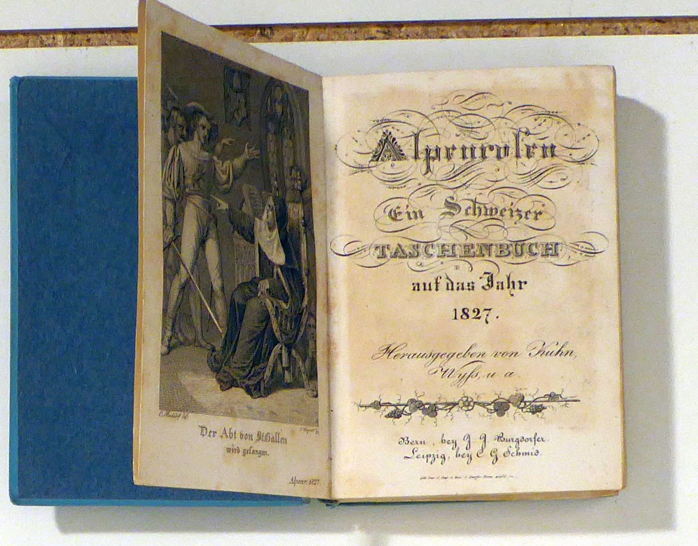 Ein Schweizer-Taschenbuch auf das Jahr 1827. Herausgegeben von [Gottlieb Jakob] Kuhn, [Johann Rudolf] Wyss u.a.. Bern; Lpz.: J. J. Burgdorfer; C. G. Schmid, 1827. 361 S., 9 Bll., mit 8 Kupfern nach Zeichnungen von Franz Niklaus König, Gabriel Lory père, Rose d'Osterwald, Johann Jakob Lips und anderen, davon eines als Frontispiz und 3 mehrfach gefaltete Blätter, sowie mehrfach gefaltet 1 Holzschnitt und 1 Musikbeilage. Einband: Original-Pappband. Format: kl.8°. Enthält unter anderem das Lied "Auf den Rigi" von Agnes Emerentia Geyer, mit Noten, sowie "Der Appenzeller Krieg, in neun Romanzen" von Gustav Schwab