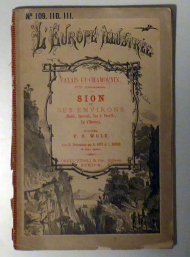 VIe livraison: Sion et ses environs (Rawil, Sanetsch, Pas de Cheville, Val d'Hérens) d'après F[erdinand] O[tto] Wolf. Zch.: Orell Füssli, [1888?]. S.483 - S.614, mit 33 Holzstich-Illustrationen von J. Weber und E. Metton und 2 Karten. Einband: Illustrierter Or.Umschlag. Format: kl.8°. Reihe: L'Europe illustrée No. 109, 110, 111.