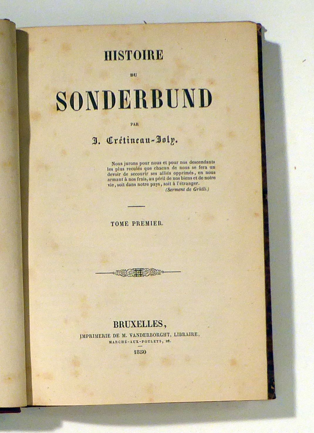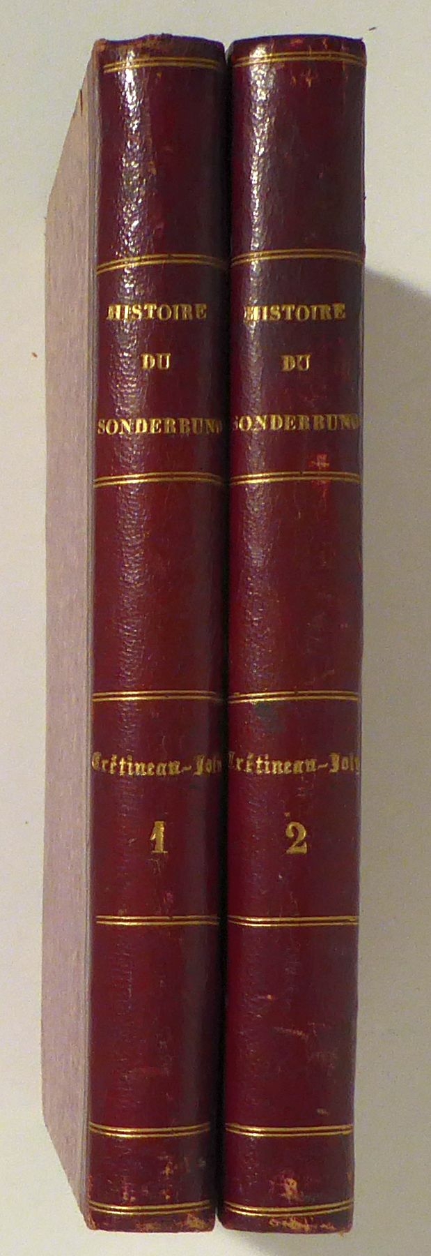 [2 volumes]. Bruxelles: M. Vanderborght, Libraire, 1850. 288; 292 S-, Einband: privater Halblederband. Format: 8°. Barth 7965. - HLS (Créitineau-Joly). Der Autor ist ein jesuitenfreundlicher französischer Journalist und Historiker, der das zweibändige Werk in Zusammenarbeit mit dem Freiburger Jesuiten Pierre Hartmann schrieb.Seiner Meinung nach verloren die katholischen Kantone den Krieg nur, weil sich Geheimgesellschaften einmischten. Weinroter Halblederrücken mit goldgeprägtem Titel und Feldern, marmorierte Überzugpapiere.