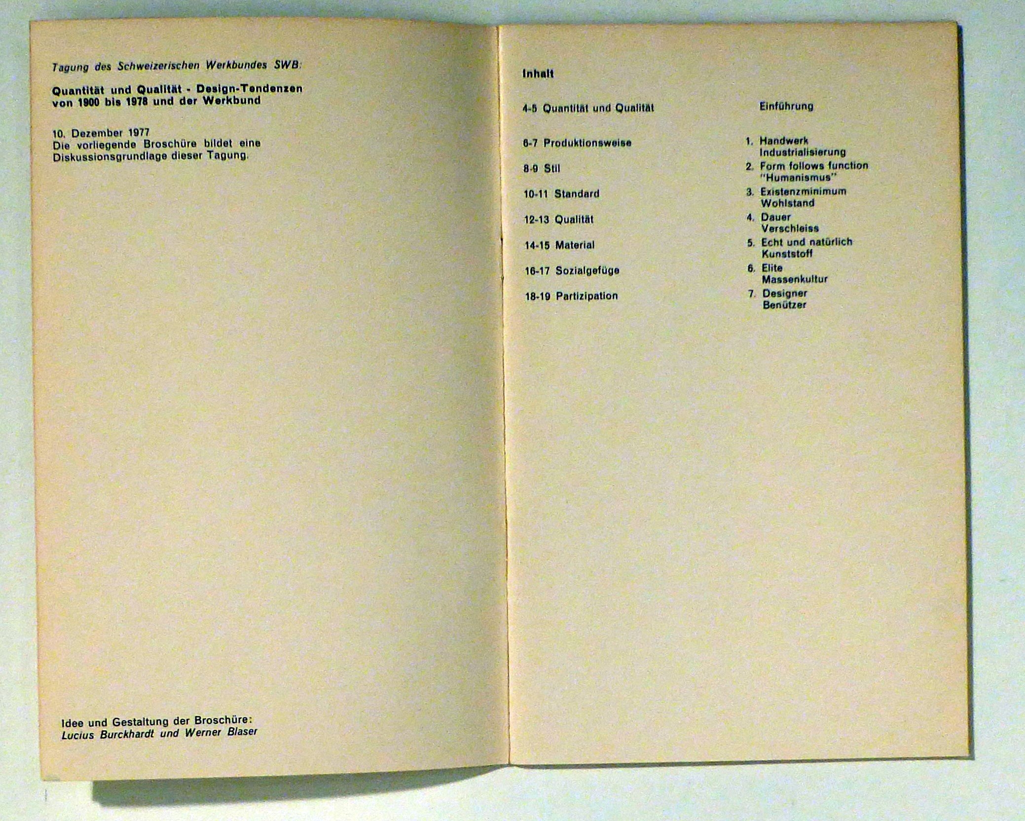Design-Tendenzen von 1900 bis 1978 und der Werkbund. Milano: Electa Editrice, 1977. 19 S., mit zahlreichen s/w Illustrationen nach Fotografien und Zeichnungen. Einband: Original-Broschur. Format: 8°. Die vorliegende Broschüre diente als Grundlagenpapier für die Tagung des Schweizerischen Werkbundes SWB am 10.Dezember 1977- Idee, Gestaltung: Lucius Burckhardt, Werner Blaser
