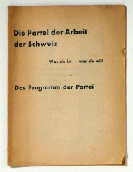 Was sie ist - was sie will. Das Program der Partei. o. o.: [Verlagsgenossenschaft Vorwärts], 1959. 46 S.., Einband: ohne Einband. Format: 8°. Programm, angenommen an dem VII. Kongress der Partei der Arbeit der Schweiz 16. bis 18. Mai 1959