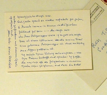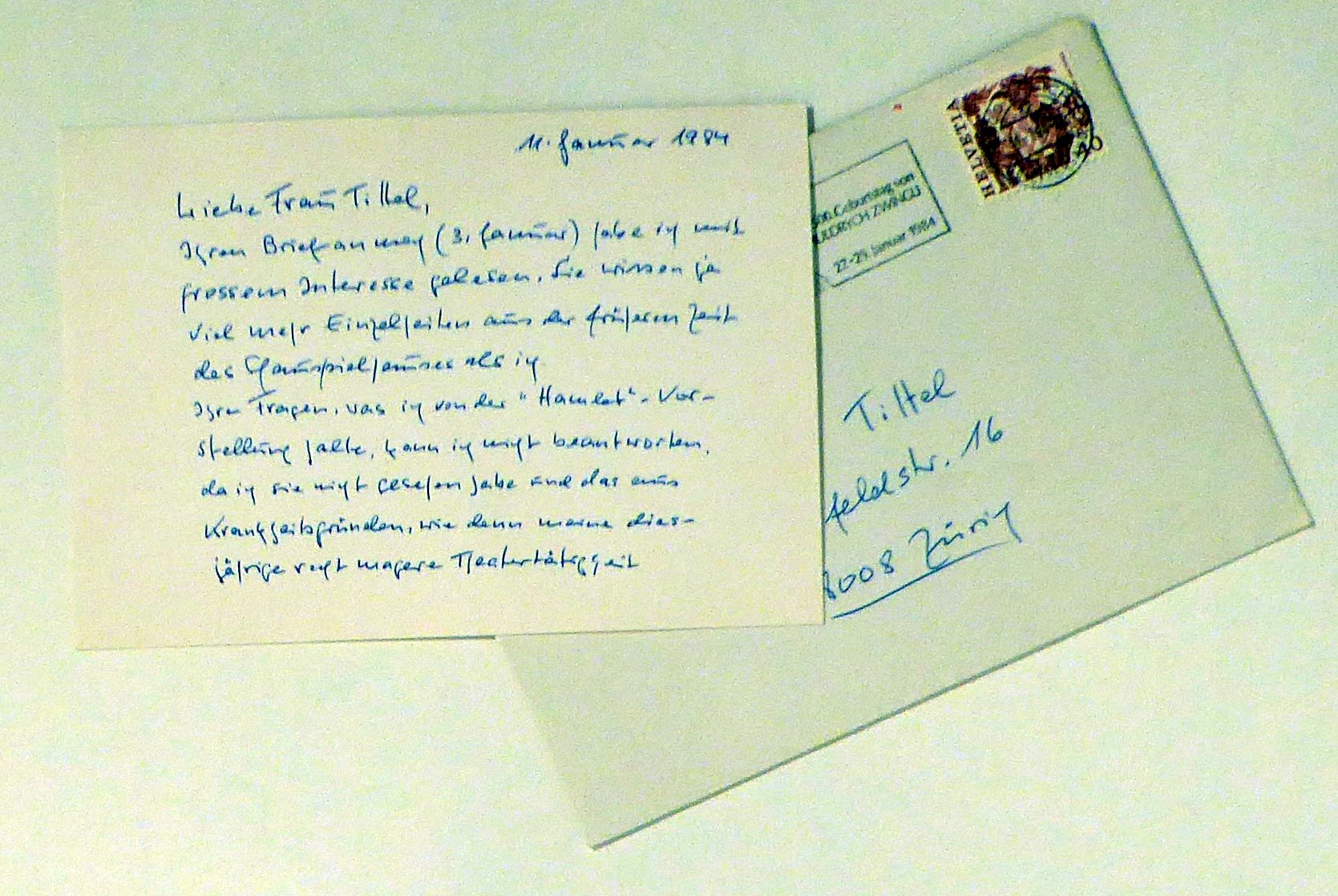 1984. Einband: Briefkarte in Umschlag. Parker bedankt sich für einen längeren Brief vom 3. Januar 1984 in dem die Empfägerin offenbar sehr detailreich über das Zürcher Schauspielhaus geschrieben hatte. Zur aktuellen Hamlet-Inszemierung könne er sich nicht äussern, weil er sie aus gesundheitlichen Gründen noch nicht gesehen habe. Über Max Sturzenegger wisse er so gut wie nichts, und das obgleich seine Frau Heidi doch eine geborene Sturzenegger, also eine Appenzellerin, sei. Sturzenegger war Gründungsmitglied und Verwaltungsrat der Neuen Schauspiel AG, der früheren Trägergesellschaft des Schauspielhauses. Schliesslich hofft er, Frau Tittel noch oft im Schauspielhaus zu sehen und dass sie bald wieder zufriedener damit sein werde. Intendant war damals Gerd Heinz (1940*).