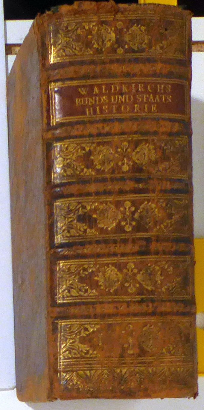 Samt einem Entwurf der Regiments-Beschaffenheit in den Hochlöblichen Eydgnossischen Orten. Alles aus den bewährtesten alten und neuen Scribenten, Chronicken, Manuscripten, Archiven, und mitgetheilten glaubwürdigen Schrifften mit getreuem Fleiss zusam. Neu vermehrte und verbesserte Auflage. Basel: Emanuel Thurneysen, 1757. 2 Teile in einem Band; [30], 310, [14]. 162; 587, [14], 74 S., Einband: Leder d.Zt. auf 5 Bünden mit dxreiseitigem roten Farbschnitt. Format: kl.8°. Barth 110235. - Feller/Bonjour 555. - HBLS VII, 366. Anders als die Geschichtswerke der Zeit, befasste sich der Basler Jurist nicht (nur) mit einzelnen Kantonen, sondern versuchte eine Gesamtsicht der Schweiz zu geben (Feller/Bonjour) sowie über diie geltende Rechtspraxis. Nützlich ist sein Werk namentlich wegen der detaillierten Übersicht über die Verträge, Pakte und Chroniken der Zeit. Ganzlederband der Zeit mit fünf floral verzierten Bundfeldern und einem Bundfeld mit goldgeprägtem Titel, die Vorsatzblätter mit marmoriertem Buntpapier. Auf dem zweiten Vorsatz eine handgeschriebene Zueignung des Werke in Sepia in lateinischer Sprache an einen Jacobus Sternenberger für seine sorgfältige Promotionsarbeit im Jahre 1772. Diese zweite, erheblich erweiterte und korrigierte Ausgabe ist eher selten