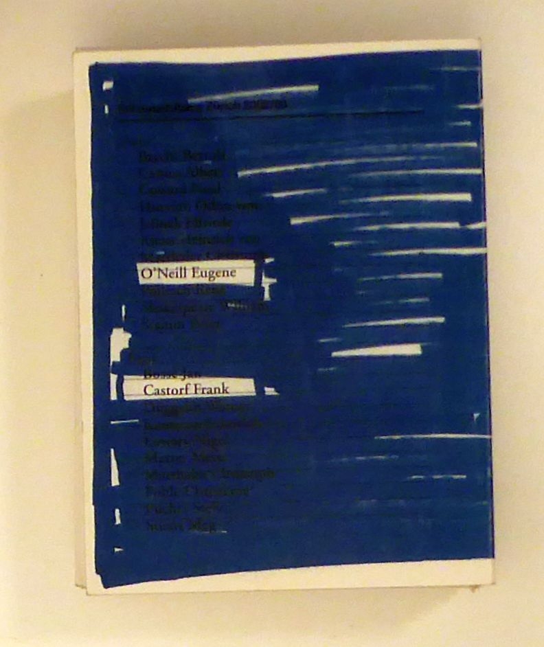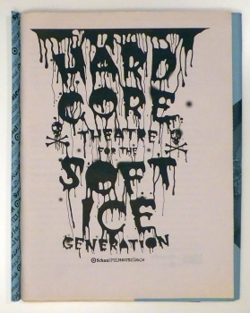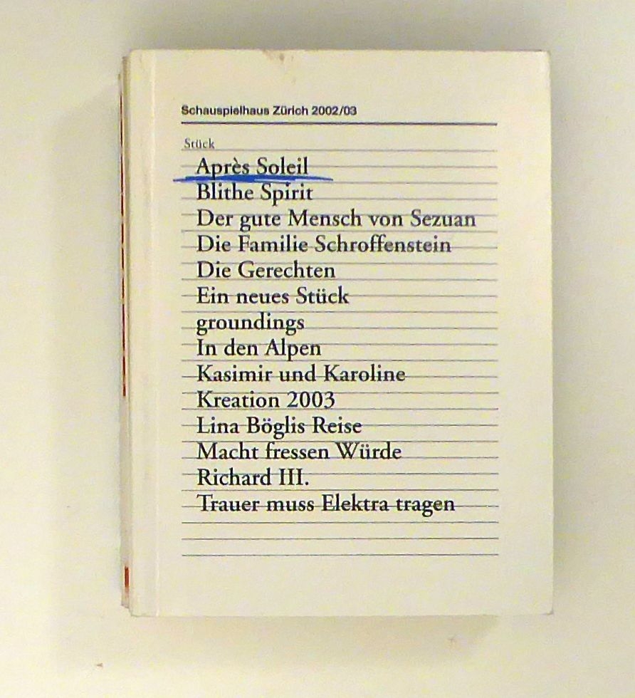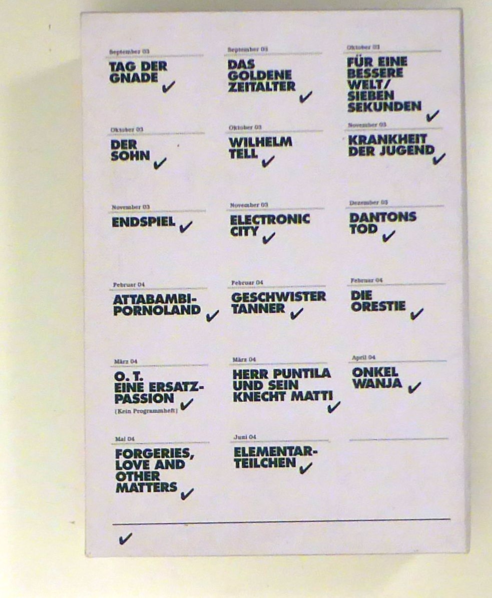 Hard Core Theatre for the Soft Ice Generation. Zürich: Schauspielhaus Zürich, 2004. 256 S. 14 Hefte, 16 Hefte in Kassette, Einband: Original-Broschur. Format: 2°, kl.8°. "Wenn man sich verabschiedet, dann denkt man, dass alles, was wir nicht gemacht haben, das Schönste hätte werden können." Damit leitet Christoph Marthaler den dicken Rückblick auf sein - nicht freiwillig - vorzeitig beendetes Engagement am Zürcher Schauspielhaus ein. Ihm war es ergangen wie 30 Jahre zuvor Peter Löffler und seinem Regisseur Peter Stein, er musste wie sie gehen, weil ihr Theater sowohl aus politischen als auch pekuniären Gründen nicht passte und ihre Vertreter in den Räten deshalb für die Streichung der Gelder sorgten. Ein dicker, mit diversen Spitzen gespickter Rückblick, so zeigt auf dem Umschlagblatt ein Wegweiser, wohin es zum Schauspielhaus geht und wohin - in entgegengesetzter Richtung - nach Zürich. Mit Bildern und Texten aus diesen Jahren und einem vorbildlichen chronologischen und alphabetischen Index zu den Produktionen sowie einem Verzeichnis aller Personen die da waren.Dazu lose alle 14 Programmhefte zur Saison 2002/2003 und, in einer bedruckten Kassette, alle 16 Programmhefte zur Saison 2003/2004