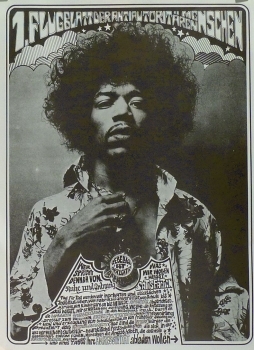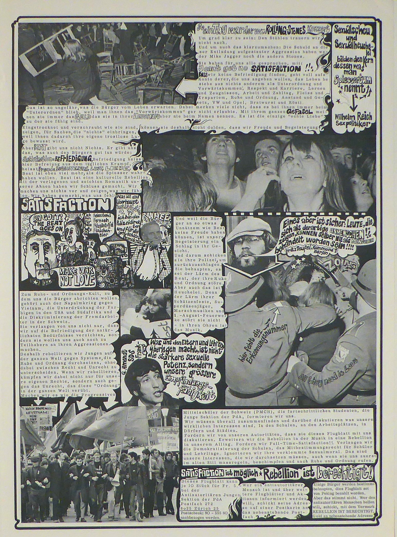 Rebellion ist berechtigt. Zürich: Junge Sektion der PdA, 1968. 1 Bl., Format: 31x43 cm (bxh). Erstausgabe. Von der Antiautoritären Jungen Sektion der PdA (Partei der Arbeit) herausgegebenes beidseitig bedrucktes Kleinplakat. Gestaltet vom Zürcher Grafiker Peter König unter Verwendung einer Fotografie von Jimi Hendrix (Vorderseite) und Fotografien vom Zürcher Rolling Stones-Konzert und Zürcher Kundgebungen von 1967 sowie einem längeren Agitationstext in gezeichneter und Schreibmaschinenschrift mit dem Motto "Satisfaction ist möglich - Rebellion ist berechtigt" (Rückseite). Initiert hatte das Plakat der Zürcher Fotograf und Archivar Roland Gretler