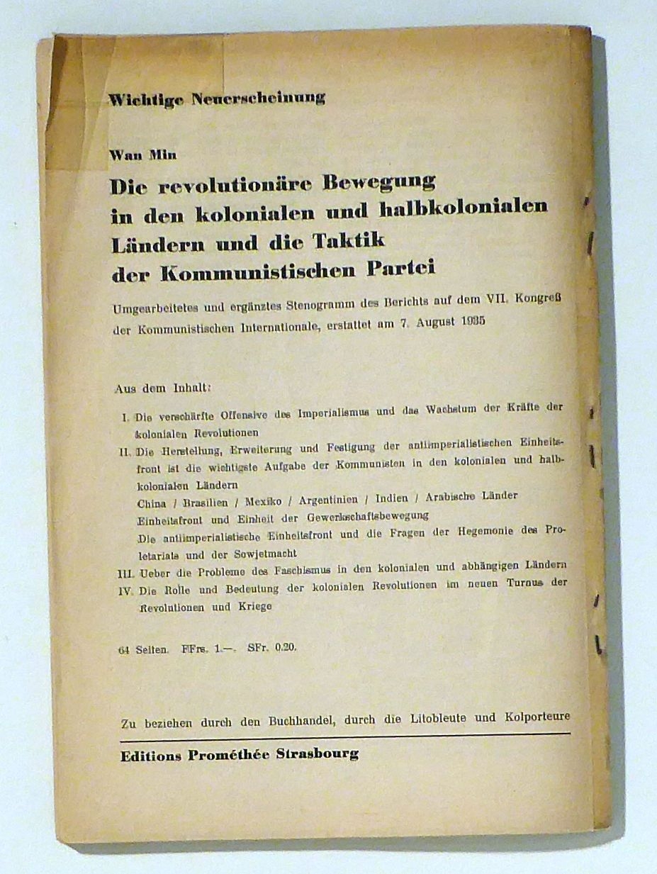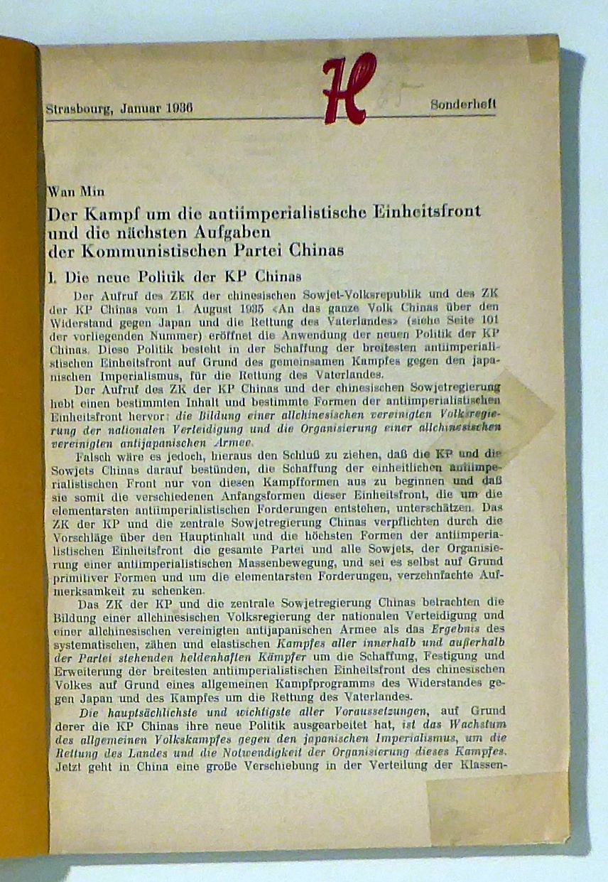 Erstausgabe. Ausserhalb der Reihe erschienenes Sonderheft mit Artikeln über China. Inhalt: Wan Min: Der Kampf um die antiimperialistische Einheitsfront und die nächsten Aufgaben der Kommunistischen Partei Chinas; Schi-Pin: Ein heroischer Marsch. Der Zweck des Marsches wurde erreicht; 507.3 Sjao Ge: Der antiimperialistische Kampf in den Kuomintang-Gebieten Chinas. Li Huan: Wie die Rote Chinesische Arbeiter- und Bauernarmee aussieht; Jan Sun: Über die antiimperialistische Einheitsfront in der Mandschurei; Wan De: Die imperialistischen Gegensätze im Fernen Osten; Führer der chinesischen Räte und der Roten Armee; Mao Dse-dun - der Führer des werktätigen chinesischen Volkes; Armeeführer Tschu de; Fan Dsi-min - ein Held des chinesischen Volkes; Vermächtnis des Genossen Fan Dsi-min vor seiner Hinrichtung; Dokumente. Aufruf an das gesamte Volk Chinas über den Widerstand gegen Japan und die Rettung des Vaterlandes; Aufruf an das mandschurische Volk anläßlich der Ereignisse in Nord-China. An die 40-Millionen-Bevölkerung der vier nordöstlichen Provinzen!; Aufruf des Revolutionären Kriegsrates der Roten Armee Chinas an das abessinische Volk. Von diesem Heft wurde auch eine, ebenfalls umschlaglose, um mehr als 50 % verkleinerte Tarnschrift gedruckt. Sehr selten