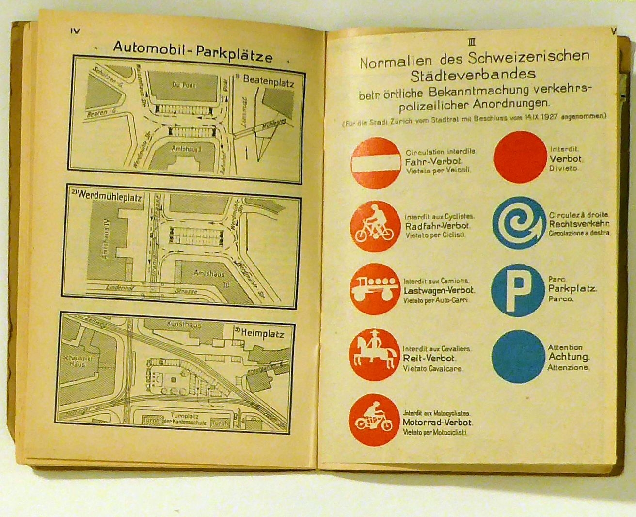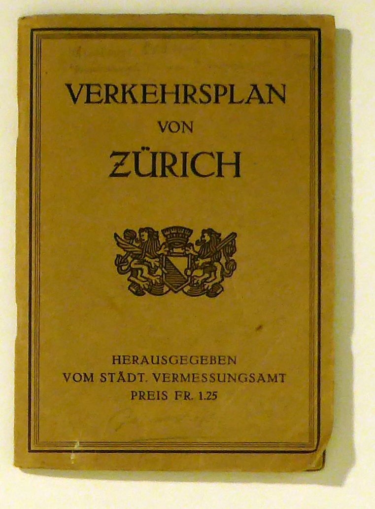 Herausgegeben vom Städt[tischen] Vermessungsamt. Masstab 1:15'000. Zürich: Städttischen Vermessungsamt, [1931]. 72 S.; 1 mehrfach gefalteter Plan 67,5 x 50 cm (bxh), mehrfarbiger Plan sowie farbige Abbildungen von Verkehrstafeln. Einband: Original kartoniert Klappenmappe. Format: kl.8°. Letzter Plan vor der zweiten Stadterweiterung von 1934. Mit Strassenverzeichnis der Stadt Zürich sowie von Affoltern, Albisrieden, Altstetten, Höngg und Oerlikon. Zudem Wegweiser ziu Ämtern, Kirchen, Friedhöfen und weiteren Institutionen, Karten der Innenstadt, der Durchgangsstrassen und den Zürichsee sowie der Parkplätze und der "Normalien des Schweizerischen Städteverbandes betreffend örtliche ekanntmachung verkehrspolizeilicher Anordnungen" - das sind Strassenverkehrstafeln