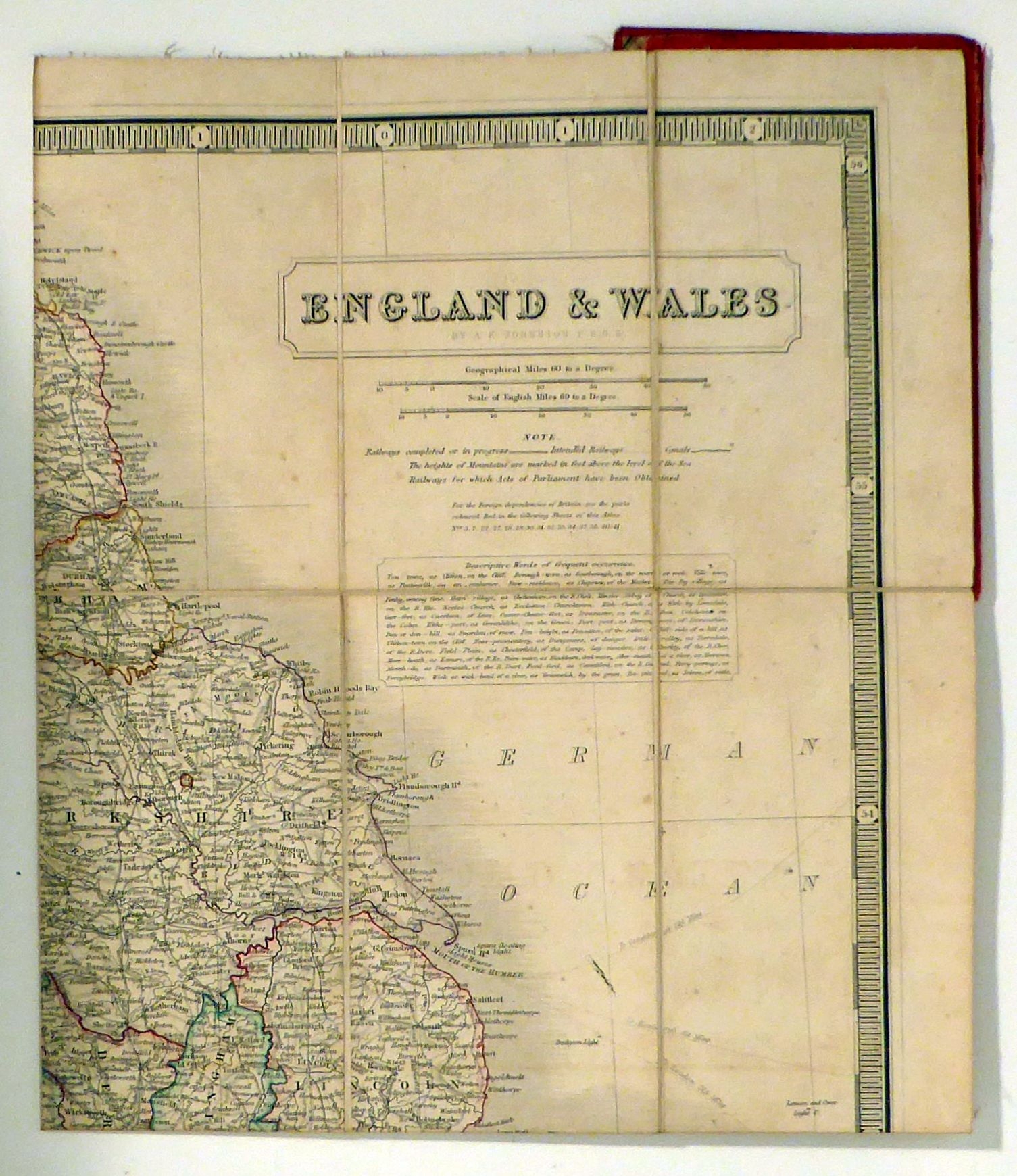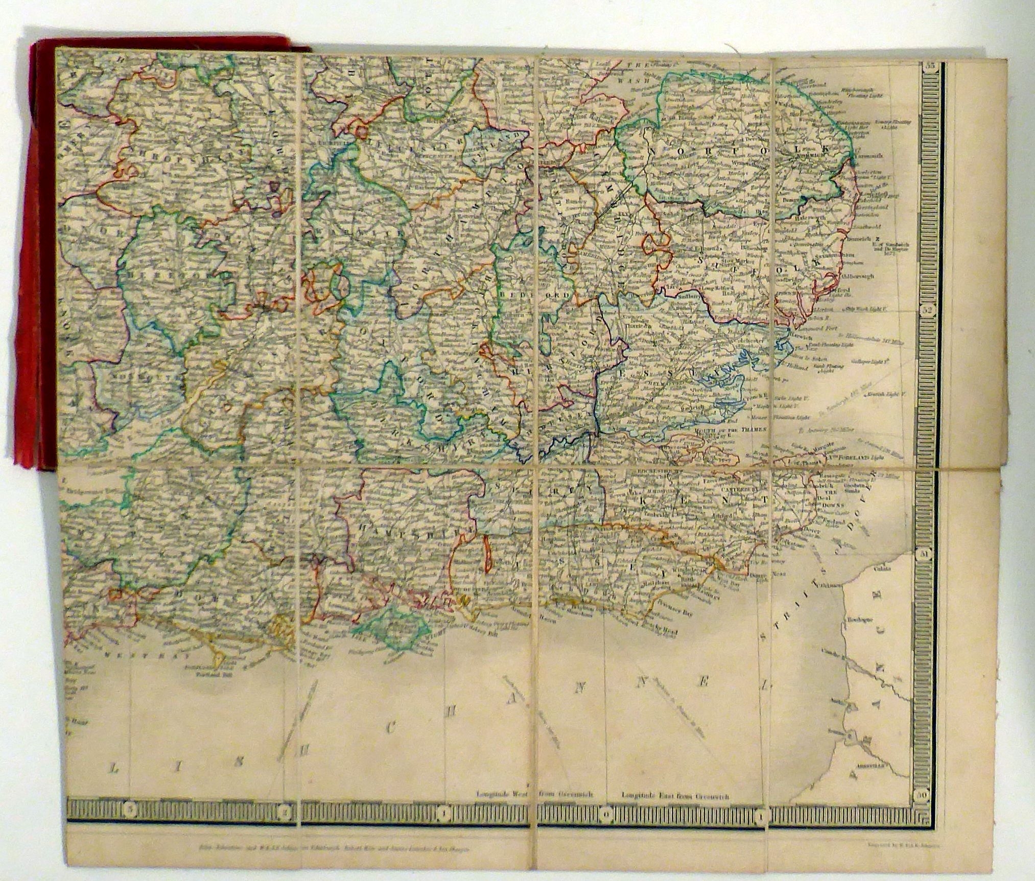 England & Wales. Edinburgh; Glasgow: Johnston and Johnstone; Weir & Lumsden, [1843]. 1 gefaltetes Blatt, Einband: Original-Leinwand. Format: 55 x 64 cm. Auf Leinwand gezogene Karte, gefaltet auf 9 x 15,5 cm und gebunden in einen goldgeprägten Leineneinband mit Bändchen zum Zubinden