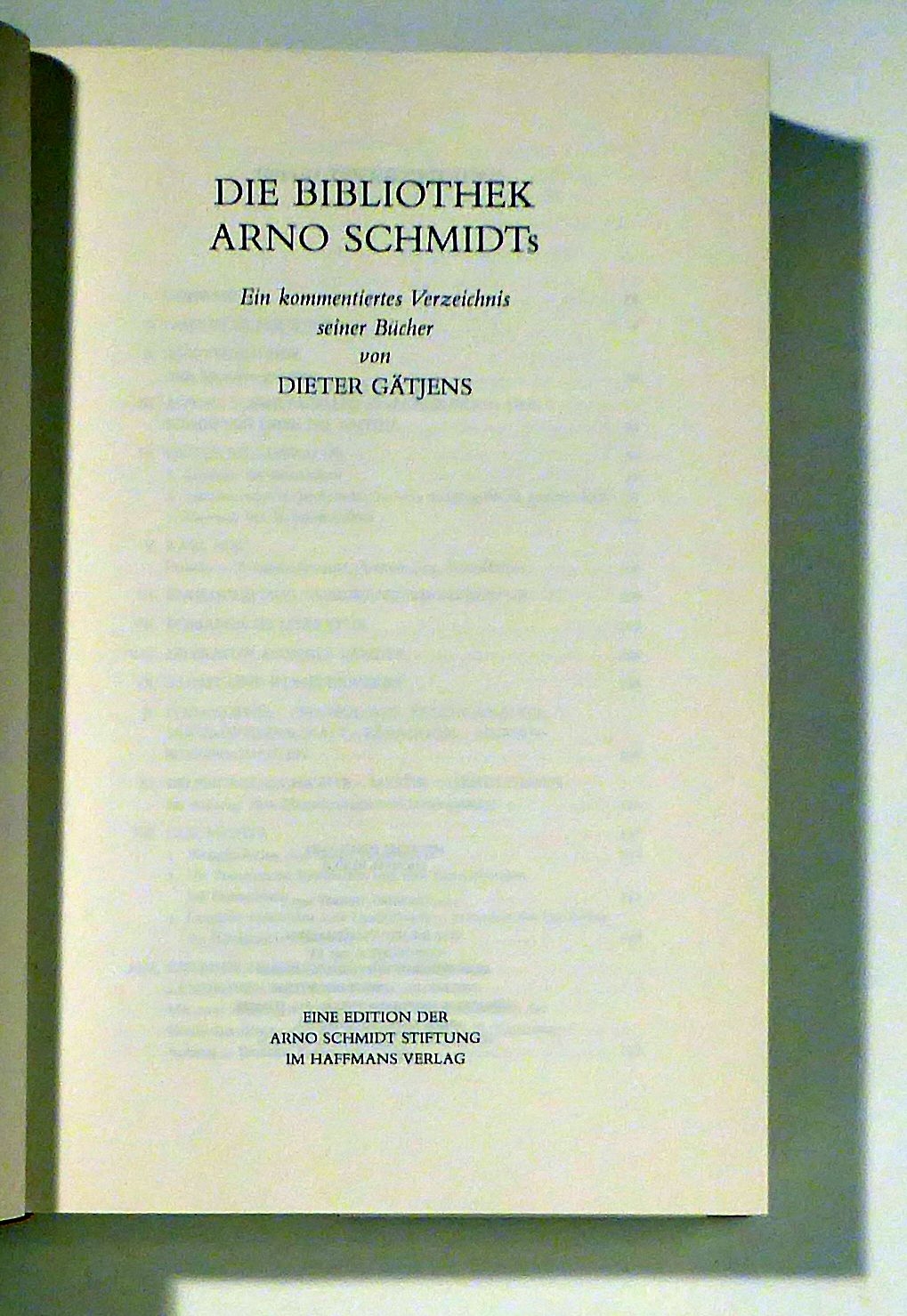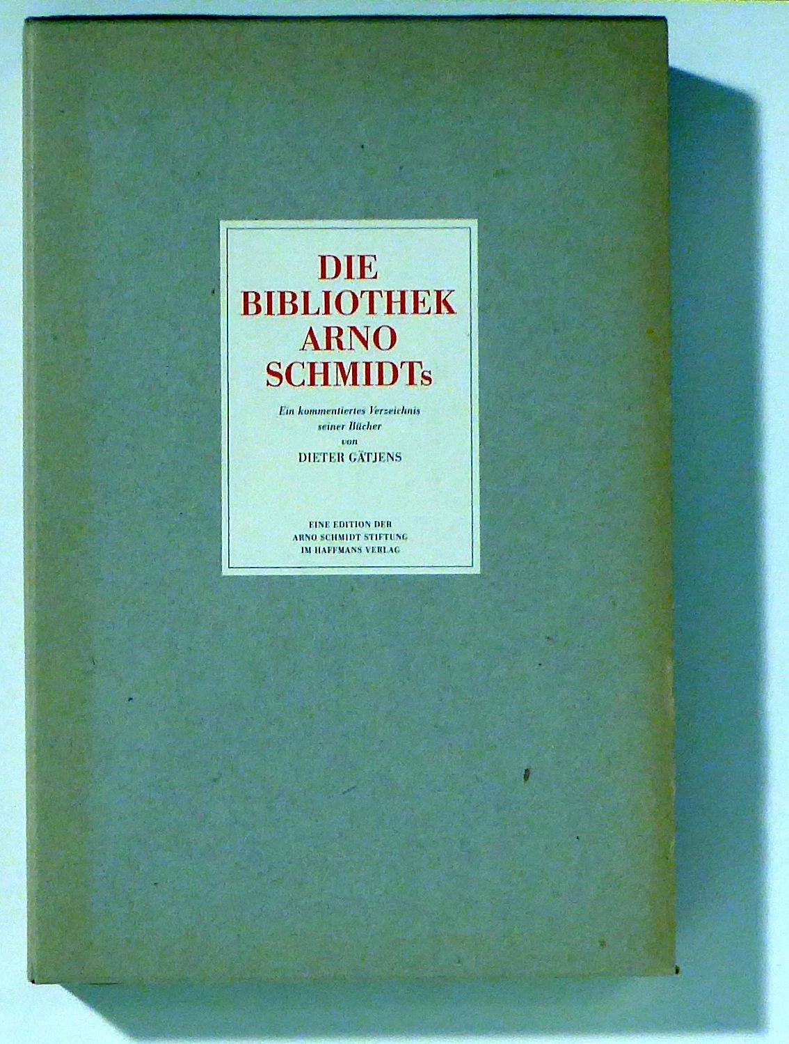 Ein kommentiertes Verzeichnis seiner Bücher. Zürich: Haffmans Verlag, 1991. 446 S., mit einem Plan der Bibliothek, 7 Abbildungen nach Fotografien von den Bücherregalen sowie einem Faksimile. Einband: Original-Leinwand mit goldgeprägtem Rücken- und Deckeltitel, mit Lesebändchen, in Kartonschuber. Format: gr.8°. Erstausgabe. Eine Edition der Arno Schmidt Stiftung