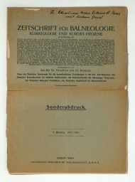 (Eine balneologisch-chemische Studie). Bln.; Wien: Allgemeine Medizinische Verlagsanstalt, 1912-1914. 685-688; 429-436, Einband: Original-Broschur. Format: 4°. Zwei Aufsätze, als Sonderdruck der Zeitschrift für Balneologie, Klimatologie und Kurort-Hygiene, V. Jg., Nr. 23 und VI. Jg. Nr. 15. Beide mit einer eigenhändigen Widmung des Verfassers