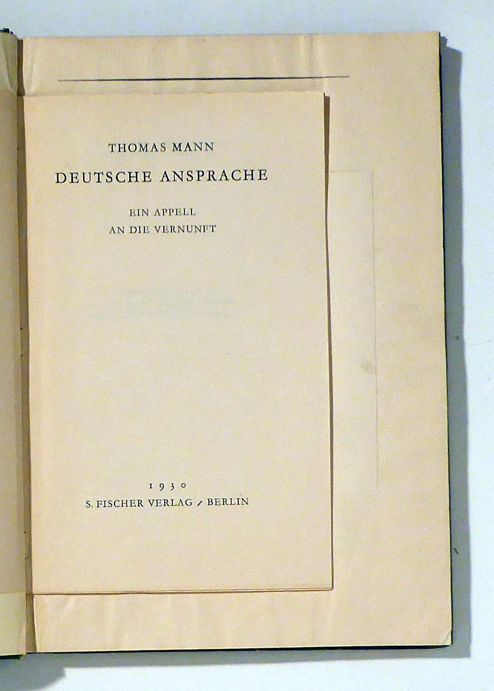 Berlin; Zürich: Fischer; Oprecht, 1930: 1937. ca. 200 S.., Einband: Pappband, fadengeheftet mit Leinenrücken und -ecken. Format: gr.8°. Erstausgabe. Sorgfältig, von unbekannter Hand zusammengestellte Sammlung von Texten Thomas Manns aus den 1930 Jahren: "Deutsche Ansprache, ein Appell an die Vernunft (Fischer, 1930, 30, (1) S.; "Ein Briefwechsel", 4.-8. Tausend, Oprecht, 16 S. sowie aus verschiedenen Nummern der "Neuen Rundschau": Goethe als Repräsentant des bürgerlichen Zeitalters", "Herzlicher Glückwunsch" (für Gerhart Hauptmann; "Leiden und Grösse Richard Wagners" und "Die Gatten" (aus Joseph in Agypten),