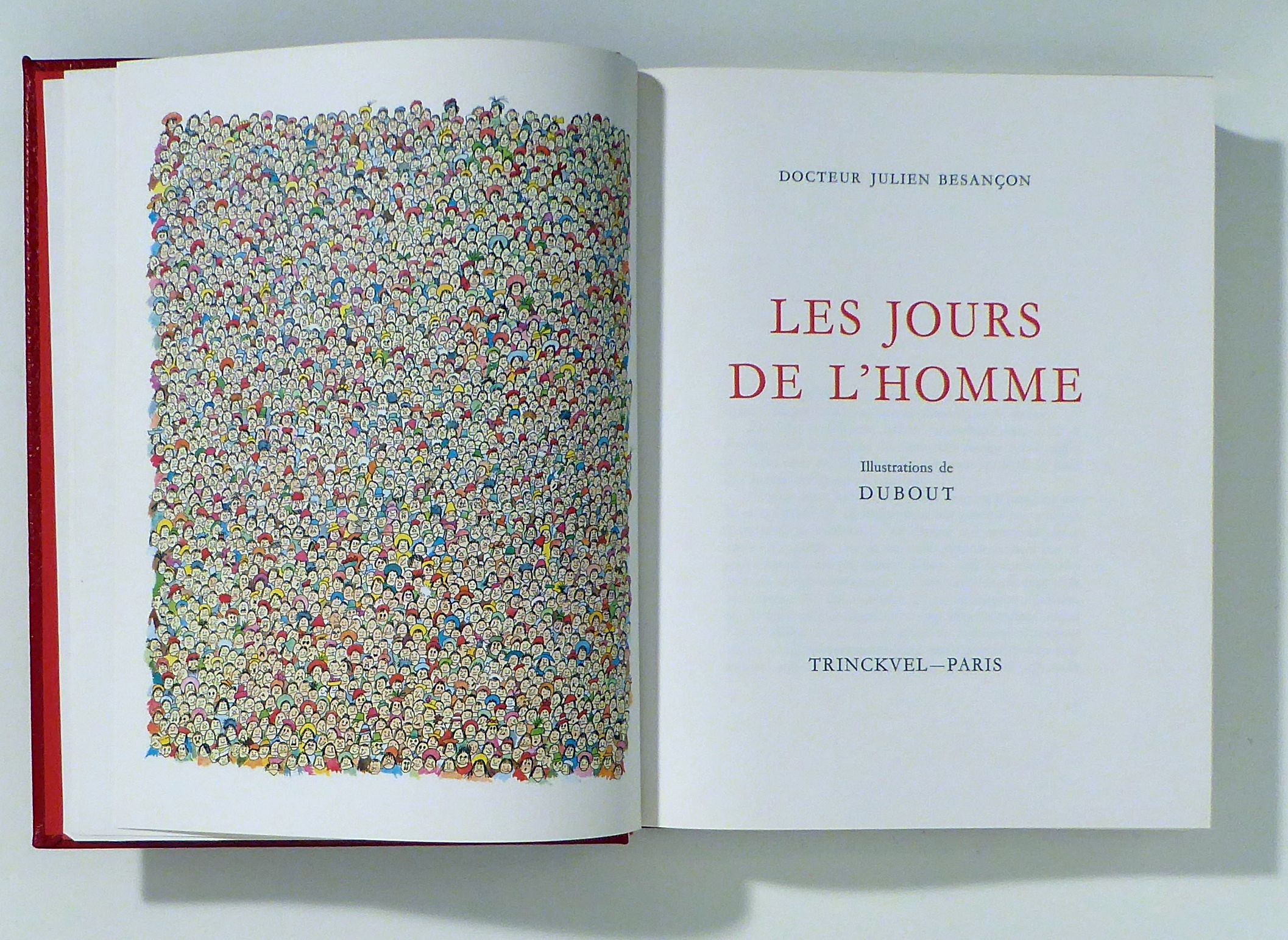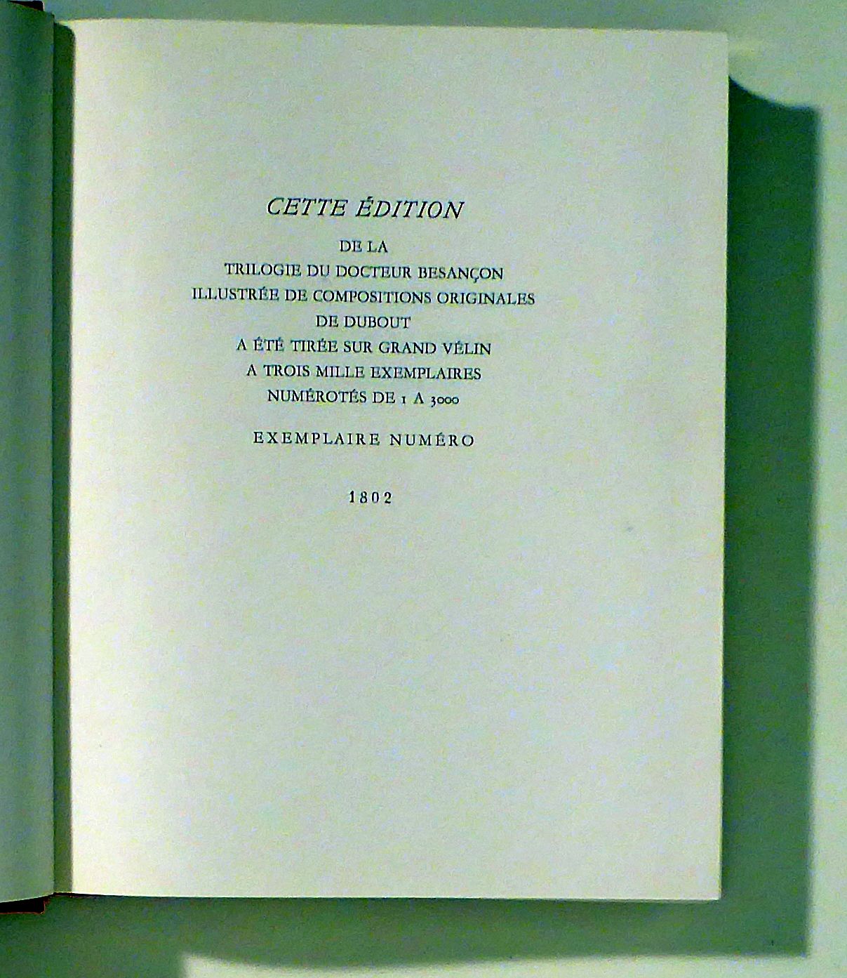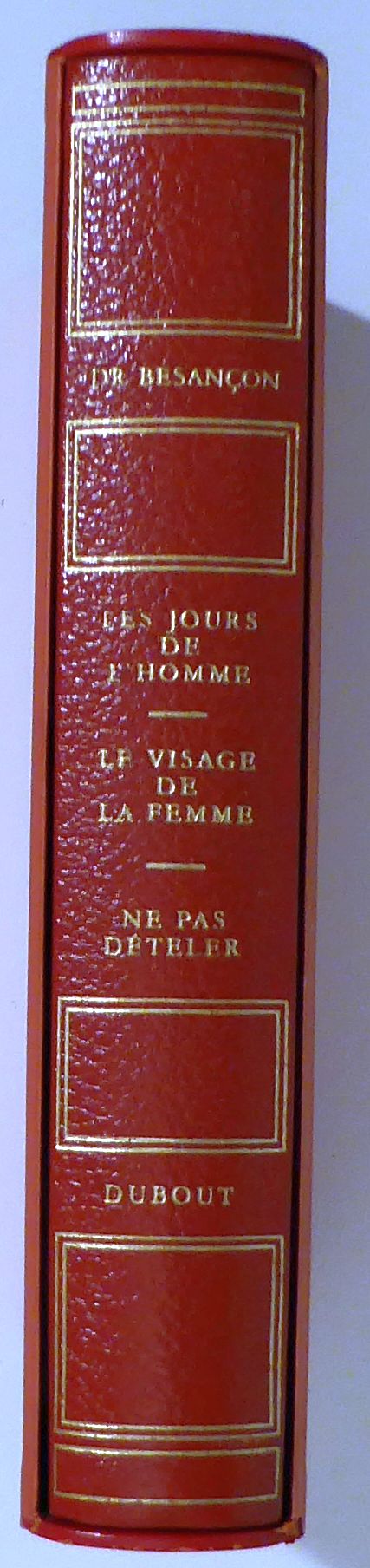 [Paris]: [Michèle] Trinckvel, 1976. 536, [7] p., 102 compositions de Dubout, dont 93 en couleurs; gardes de papier rouge orné d'un décor à répétition de caducées dessinés par Dubout. Einband: Sous etui rouge,reliure simili cuir rouge. Format: gr.8°. Trilogie du Dr. Julien Besançon, illustrée par Albert Dubout (1905-1976) en une volume: Les Jours de l'Homme - Le Visage de la Femme - Ne pas dételer. Tirage numéroté, exemplaire 1802 (de 3000)