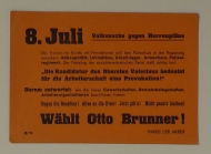 "Die Kandidatur des Obersten Vaterlaus bedeutet für die Arbeiterschaft eine Provokation!". Zürich: PdA - Partei der Arbeit, 1945. Einband: Einblatt. Format: 20x14 cm (bxh). Handzettel, rot und einseitig bedruckt, der Zürcher Sektion der Partei der Arbeit (PdA) für die Regierungsratswahlen vom 8. Juli 1945. Kandidat der PdA war der Spanienkämpfer Otto Brunner, sein Kontrahend war der freisinnige (FDP) Ernst Vaterlaus, Lehrer und von 1942-1945 Chef des Frauenhilfsdienstes. Vaterlaus gewann die Wahl.