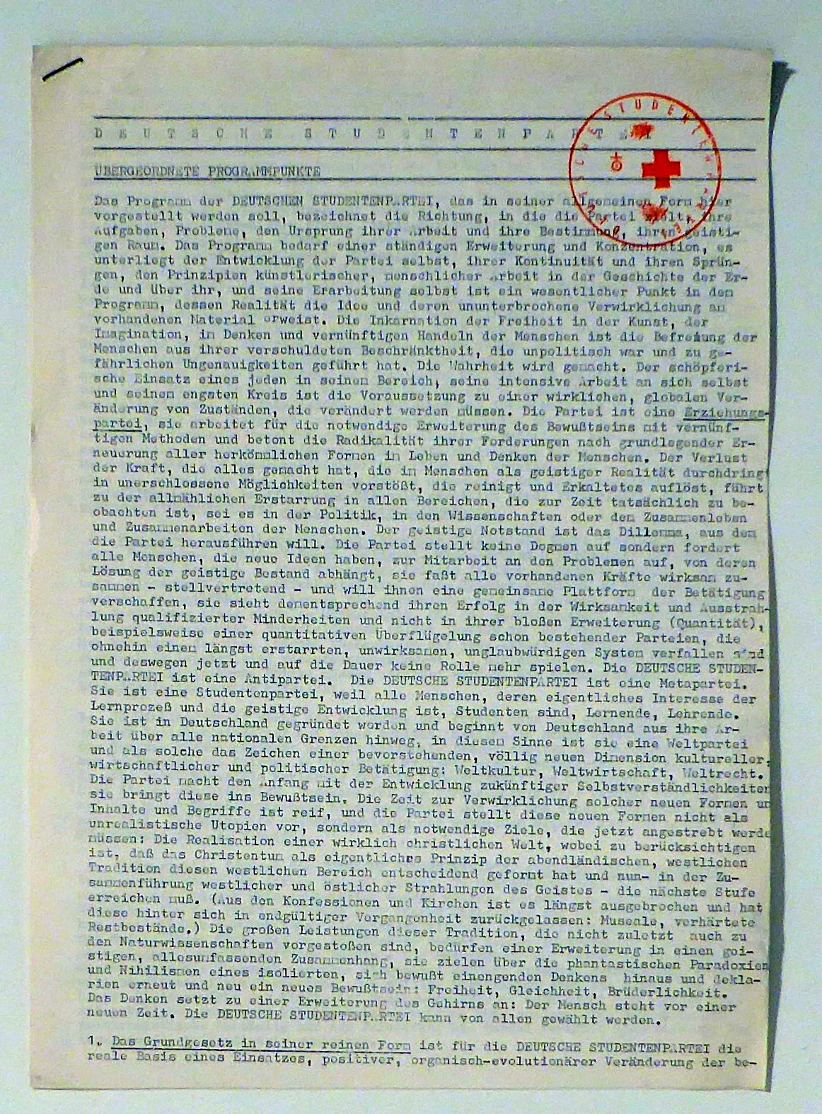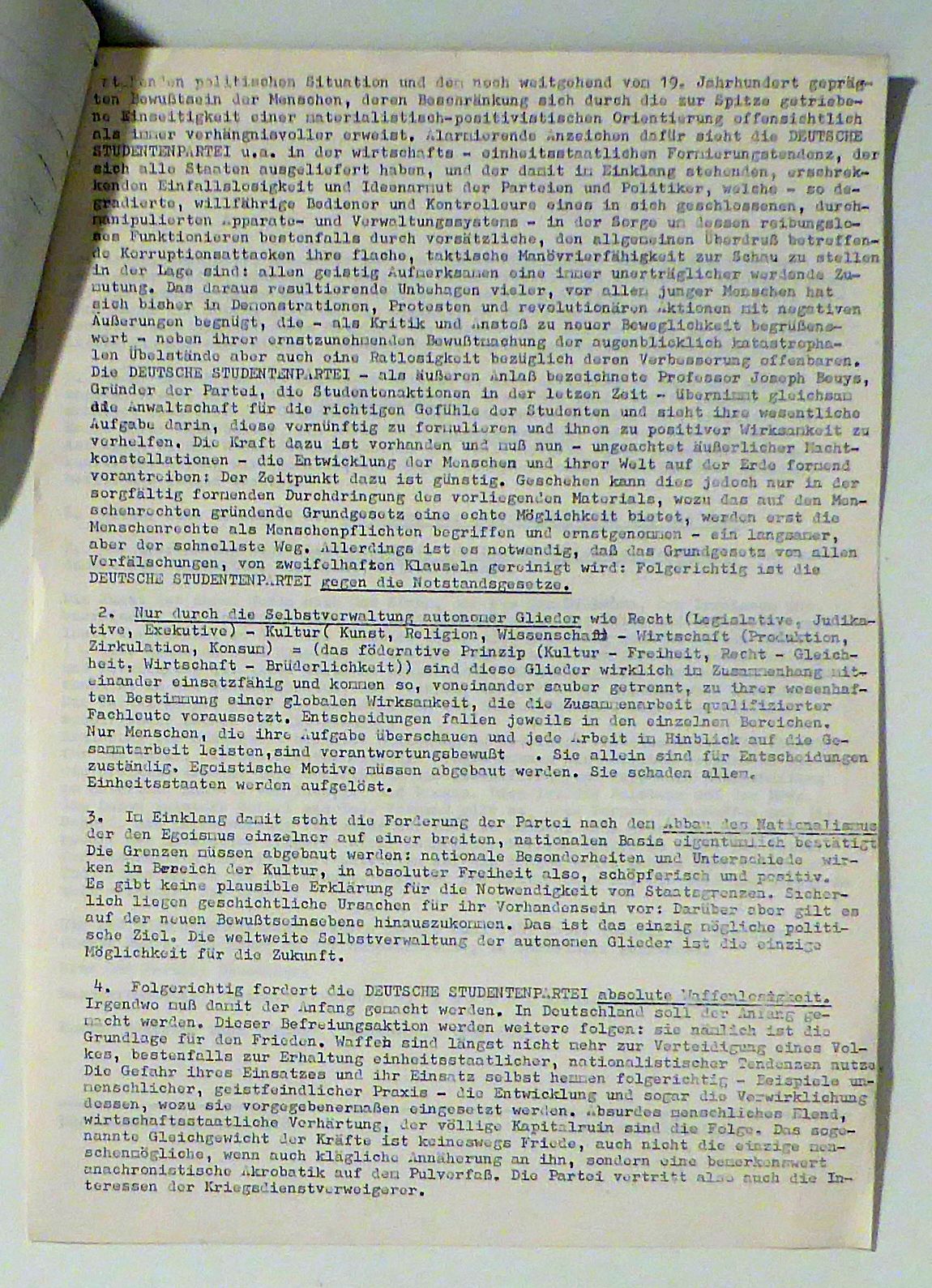 Übergeordnete Programmpunkte. Düsseldorf: Deutsche Studentenpartei, 1968. 3 Blatt, klammergeheftet, Einband: lose Bogen. Format: DinA4. Erstausgabe. Drei hektographierte einseitig eng bedruckte Seiten mit dem Programm der Deutschen Studentenpartei. Die war am 22. Juni 1967 unter dem Vorsitz von Jooseph Beuys, "Bildhauer an der Kunstakademie", in Düsseldorf gegründet worden. Beuys gab der Partei diesen Namen, weil jeder Mensch Student sei. Geschäftsführer und Verfasser dieser "Übergeordnenten Programmpunkte" war Johannes Stüttgen, Schriftsteller und Künstler, Essen. Das Programm datiert mit Düsseldorf, 21. Juni 1968 Johannes Stüttgen. Der "Beuys-Erklärer" (Deutschlandfunk Kultur) warv on Beuys zum Meisterschüler ernannt worden und ist Gesellschafter des "Omnibus für direkte Demokratie".