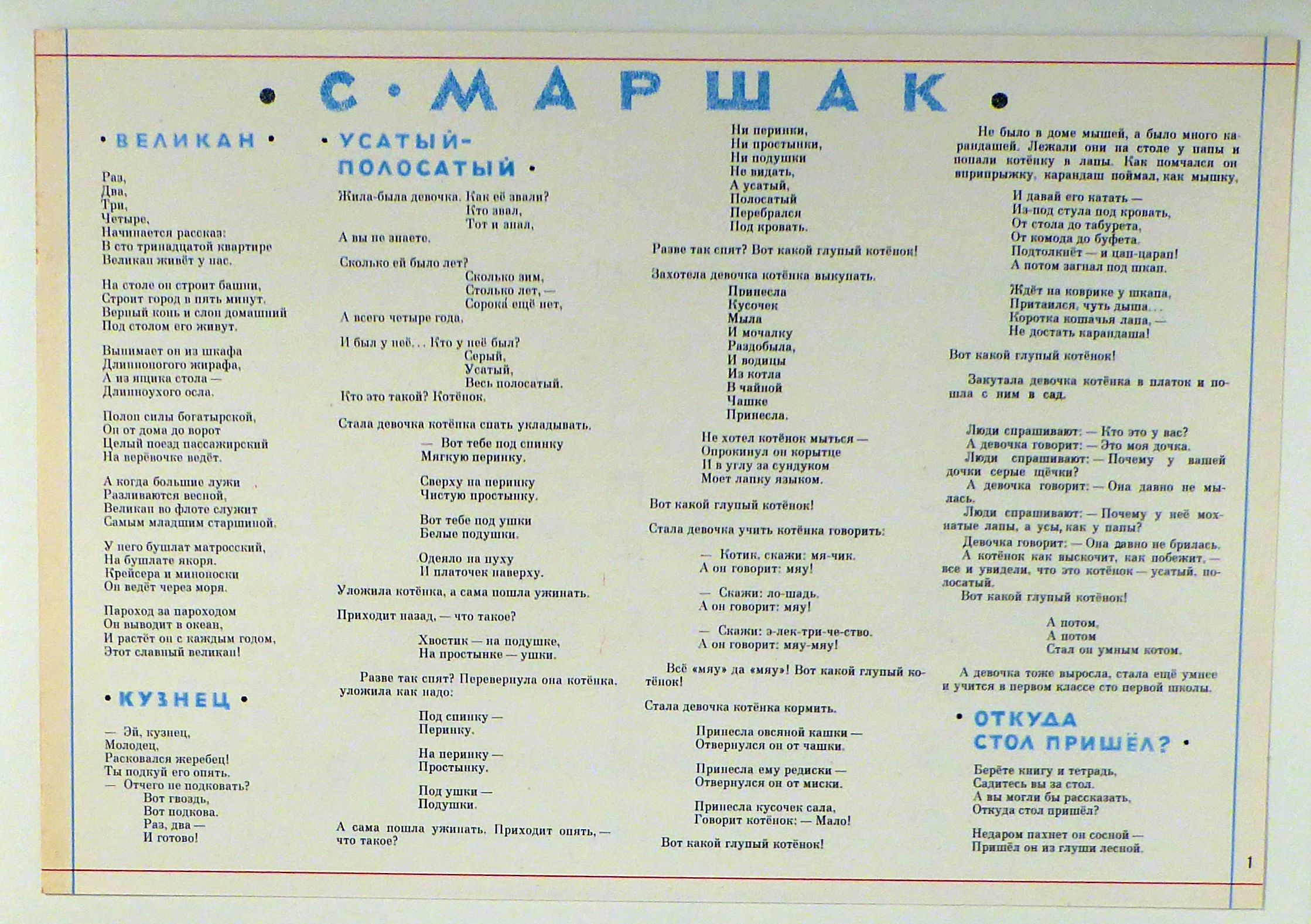 Выставка рисунков народного художника РСФСР, В.В. Лебедева к стихам С.Я. Маршака. Москва: Малыш, 1985. 9 Bl., 8 Blätter mit farbigen Abbildungen nach Zeichnungen von Vladimir Lebedev. Einband: Lose Bogen in Klappenmappe. Format: 2°. Den Eltern und dem Personal in Kindergärten etc. wird empfohlen, die 8 Blätter als kleine Ausstellung aufzuhängen und die dazu gehörenden Verse vorzulesen
