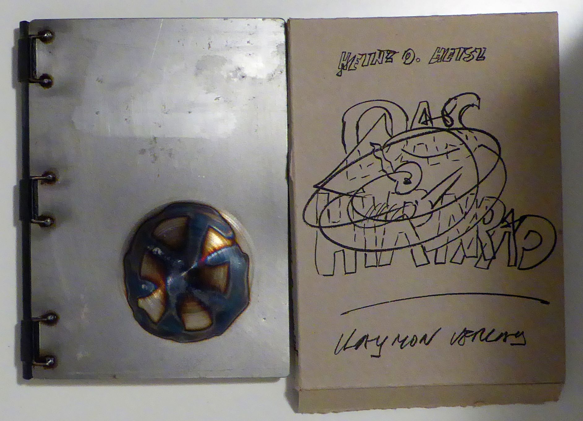 Ein literarisches Neuntagerennen mit sechs Velos aus Paul Renners Zeichenmühle. Innsbruck: Haymon, 1992. 126,[1] S., mit 6 ganseitigen Zeichnungen im Text und einer beidseitigenTitelzeichnung auf dem Schuber. Einband: mit 2 Stahlplatten als Deckel sowie schwarzem Lederrücken in Schmuckschuber. Format: 8°. Erstausgabe. Exemplar 146 einer signierten Auflage von 222 Exemplaren. Aufwendist gestaltetes Künstlerbuch, gedruckt gedruckt in verschiedenen Schriften auf teils transparenten Papieren. Die Deckel mit Stahlplatten, geschweist und bearbeitet von Anton Felbers, und einem Lederrücken mit 3 Stegen. Die sechs Zeichnungen im Buch und die Schuberillustrationen schuf Paul Renners. Selten