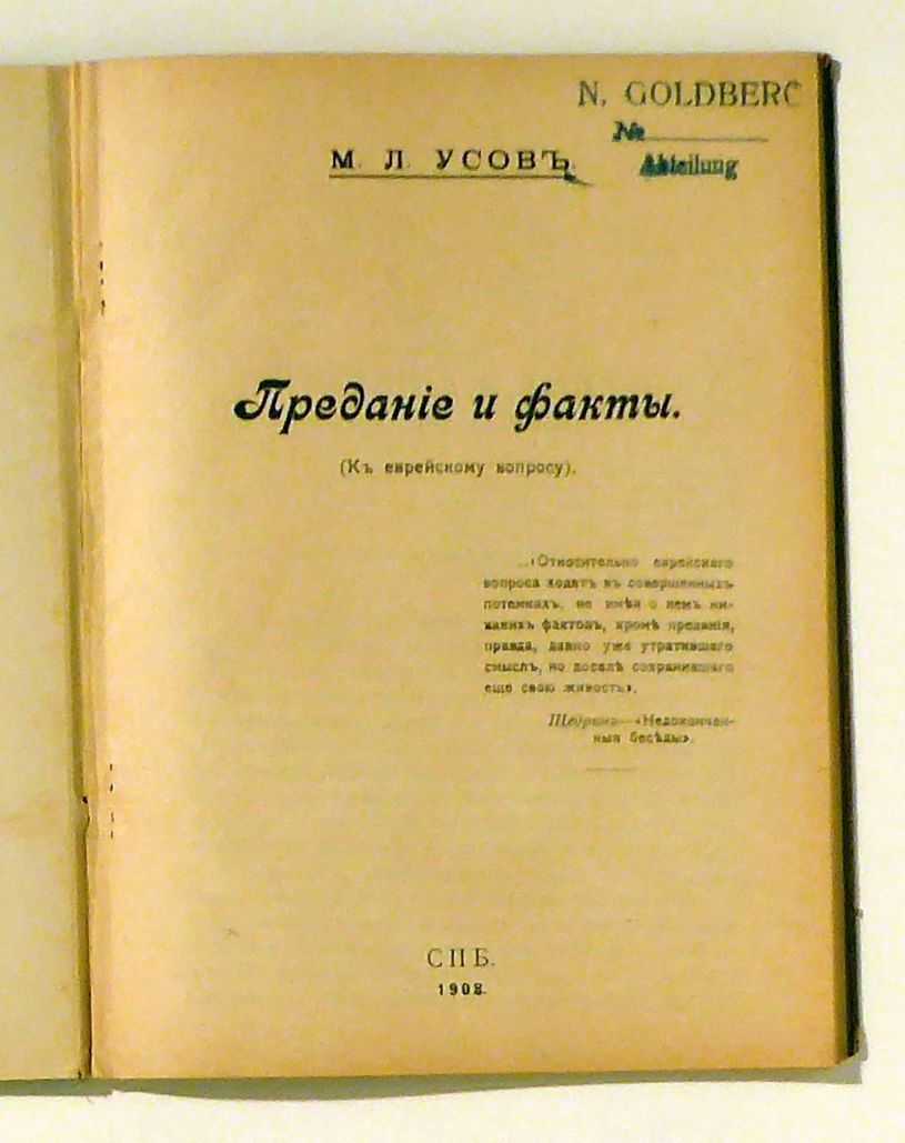 (К еврейскому вопросу). Sankt-Peterburg: Tip. Bussel', 1908. 86, [1] S., Einband: Halbleinwand der Zeit. Format: 8°.