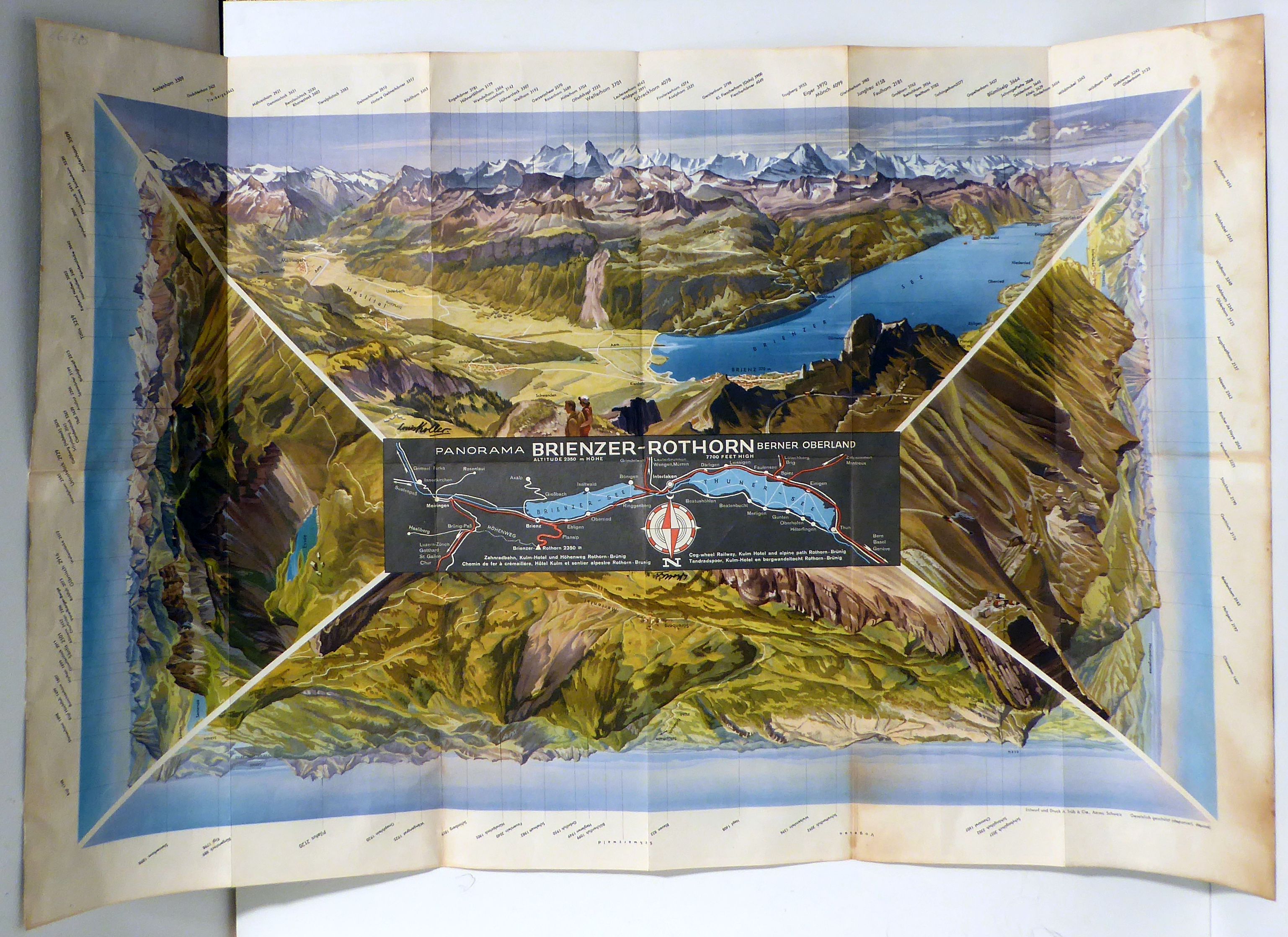 Berner Oberland: Panorama.. Aarau: Trüb & Cie, [um 1950]. 1 Bl., Format: 60 x 39 (bxh); gefaltet 10 x19,5 cm. Mit 18 s/w Abbildungen nach Fotografien von Robert Würgler und Hans Kaspar Maeder, Rückseite farbiges Panorama (360°) nach einer Zeichnung von Louis Koller, darin eingeklinkt noch eine Übersichtskarte von Thuner- und Brienzersee. Herausgegeben von der Brienz-Rothorn Bahn und dem Hotel Rothorn-Kulm