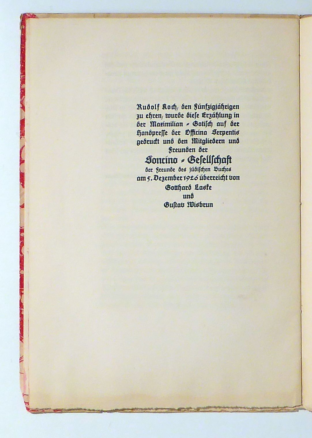 [Berlin-Steglitz]: Officina Serpentis, 1926. 8 Bl., Einband: Original-Broschur, marmoriertes Umschlagpapier. Format: 4°. Bürger/Sonder/Wallmeier 62. - Horodisch 40. - Heider 55. Druckvermerk: "Rudolf Koch, den Fünfzigjährigen zu ehren, wurde diese Erzählung in der Maximilian-Gotisch auf der Handpresse der Officina Serpentis gedruckt und den Mitgliedern der Soncino-Gesellschaft der Freunde des Jüdischen Buches am 5. Dezember 1926 überreicht von Gotthard Laske und Gustav Wisbrun." Übersetzt von Joseph Zedner, Nachwort von Herrmann Meyer. Umschlag mit Kleisterpapier mit Steinmarmormuster und montiertem Titelschildchen, fadengeheftet., gedruckt in Fraktur