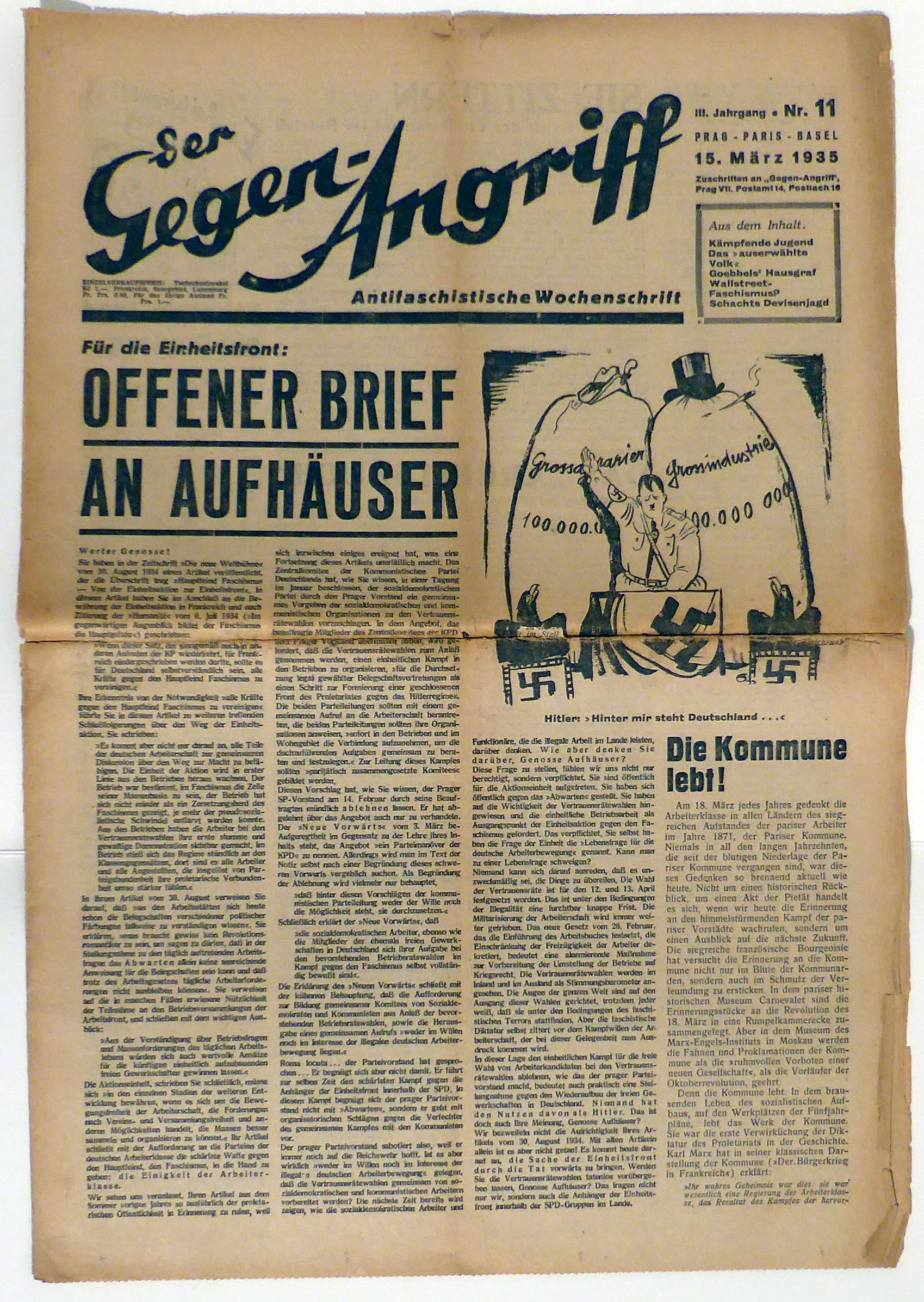 Antifaschistische Wochenschrift. Prag, Paris, Basel: Gegen-Angriff, 1935. 8 S., mit s/w-Abbildungen von Karikaturen. Einband: lose Bogen. Format: 2°. Reihe: der Gegen-Angriff, III. Jahrgang, Nr. 11, 15. März 1935.