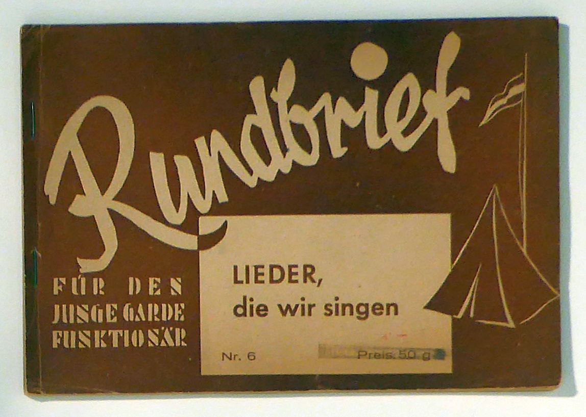 Nr. 6 Lieder, die wir singen. [Wien]: [Freie Österreichische Jugend, FOJ], um 1950. 57, [1] S., Einband: Original-Broschur, klammergeheftet. Format: kl.8°, quer. Erstausgabe. Texte von Kampfliedern und Wanderliedern. Die FÖJ wurde 1945 gegründet , war erst parteiunabhängig und stand später der Kommunistischen Partei Österreichs (KPÖ) nahe. Der Umschlag ist gedruckt, der Inhalt hektographiert, illustriert mit Zeichnungen und handgeschriebenen Titeln