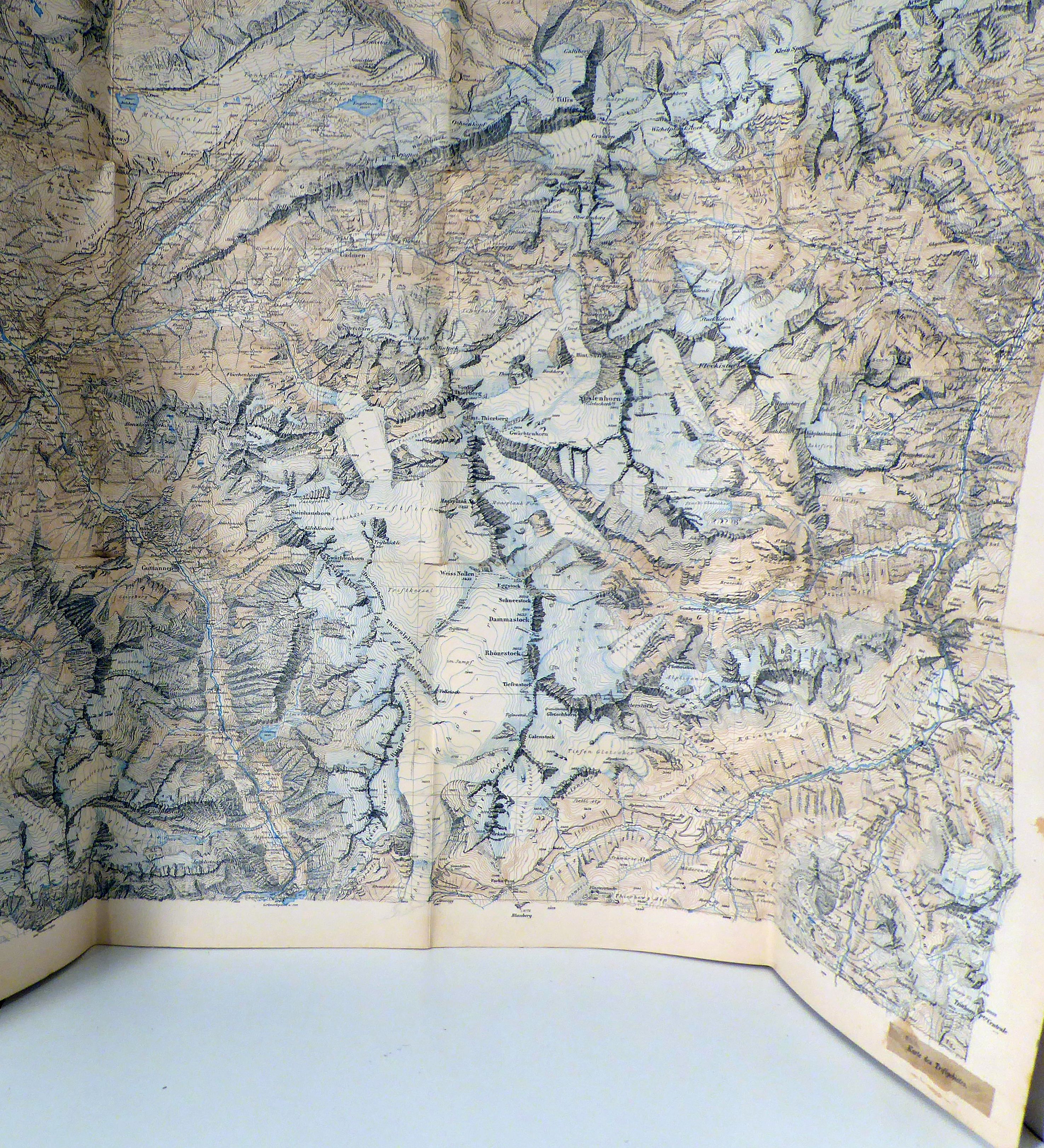 o.O.: o.V., 1 Bl., Einband: Einblatt. Format: 75 x 65 cm (bxh); gefaltet 11 x 19 cm. Auf schwerem Papier gedruckte zweifarbige Karte des Triftgebietes mit Höhenlinien und ohne Schraffen. Vermutlich handelt es sich um einen Probedruck der Karte, alle anderen gedruckten Elemente - Massstab, Kartenname, Verlag, Druckort etc. - fehlen. Unten rechts ist lediglich ein gedruckter Kleber montiert mit der Aufschrift "Karte des Triftgebietes". Der Ausschnitt reicht im Norden bis zur Oberen Lutersee-Alp, im Westen bis Rosenlauibad, im Osten bis zum Gütsch und im Süden bis zum Piz del Uomo und ist damit erheblich grösser als der der gleichnamigen SAC-Karte von 1865 von Rudolf Leuzinger. Es konnten weder der Drucker noch das Erscheinungsjahr ermittelt werden, eine Karte mit diesem Titel ist in keiner Bibliographie nachgewiesen. Auf Grund der Schreibweise von Göschenen - hier noch Geschenen - dürfte der Druck um oder kurz nach der Jahrhundertwende erfolgt sein, Gotthardlinie und Tunnel sind eingetragen. Selten