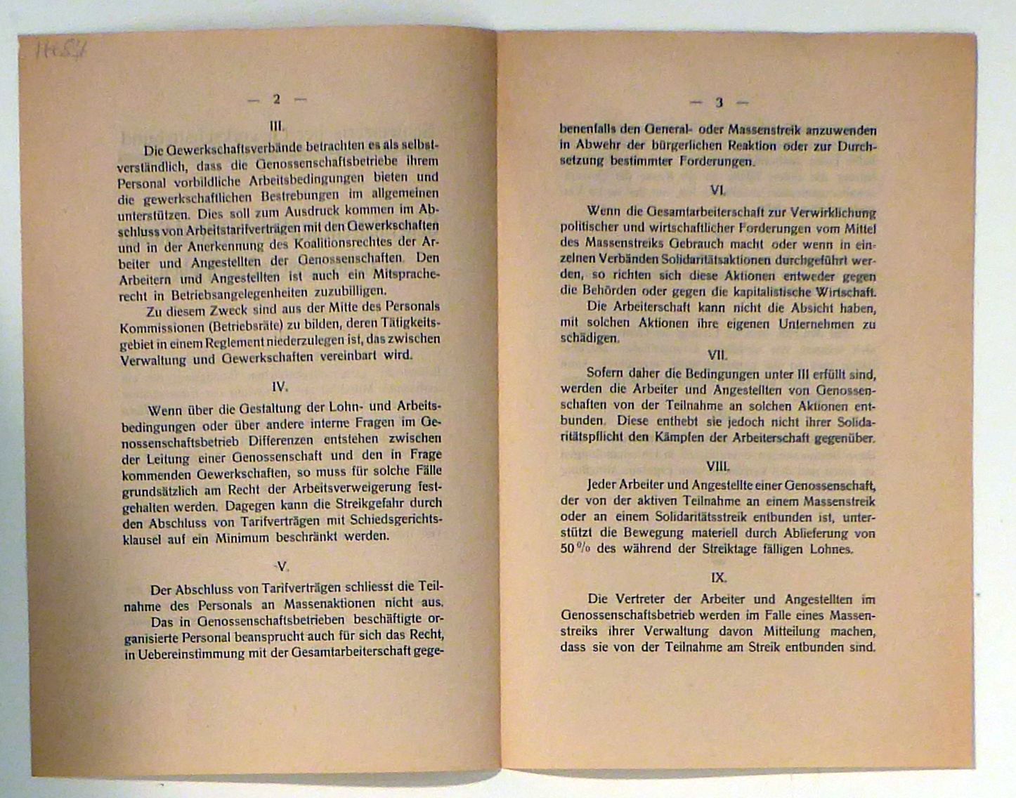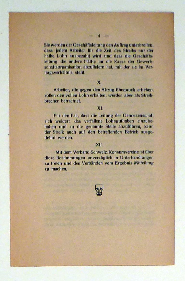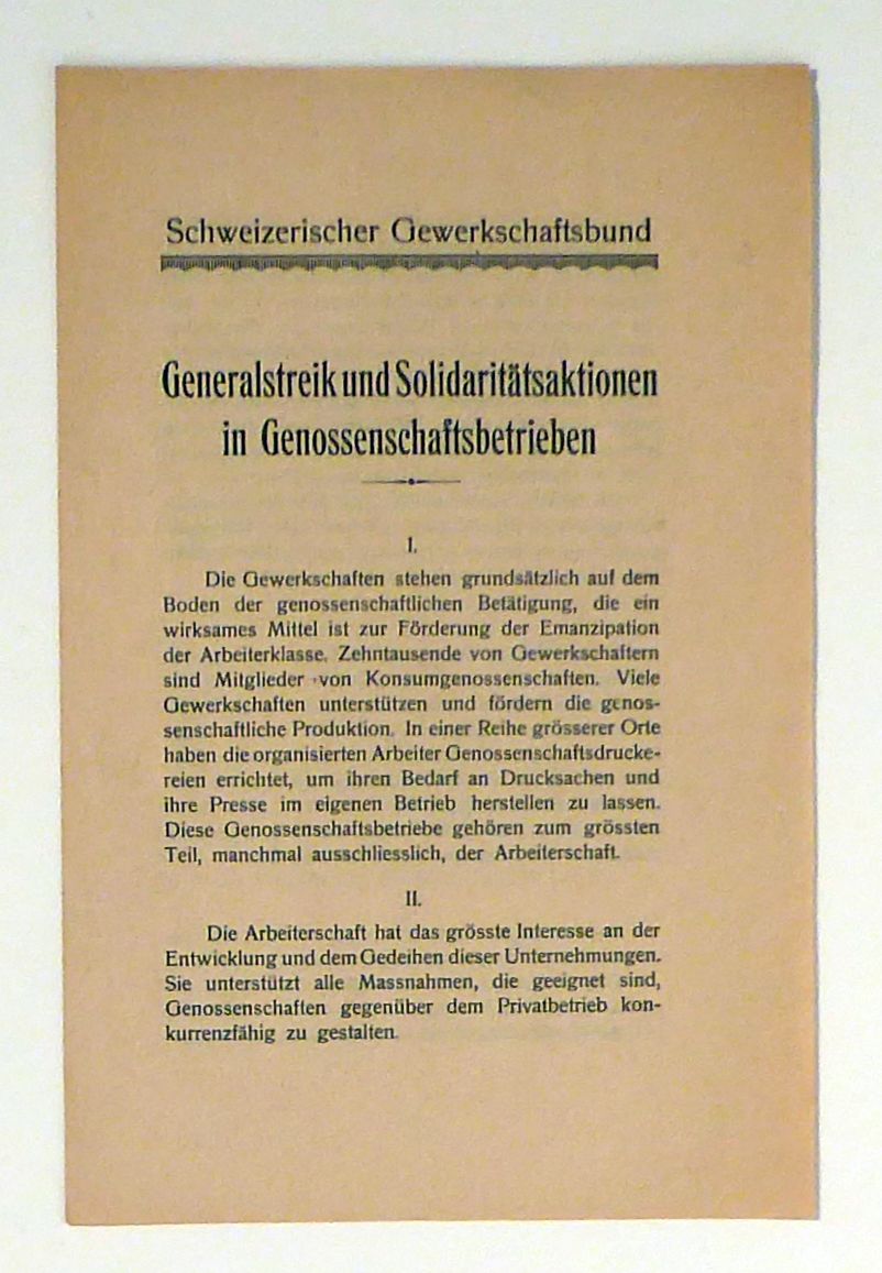 [Bern]: Schweizerischer Gewerkschaftsbund, vermutlich um 1920. Doppelbogen, Einband: lose Bogen. Format: 8°. Aus zwölf Paragraphen bestehende Beschreibung des Verhältnisses der Konsumvereine, Genossenschaftsdruckereien und ähnlicher Organisationen der Arbeiterschaft und ihrer Mitglieder zum Schweizerischen Gewerkschaftsbund. Das Erscheinungsjahr konnte nicht ermittelt werden, da das Verhältnis zu einander und die Bedingungen genau definiert sind, ist zu vermuten, das das Dokument nach dem Landesstreik von 1918 verfasst wurde