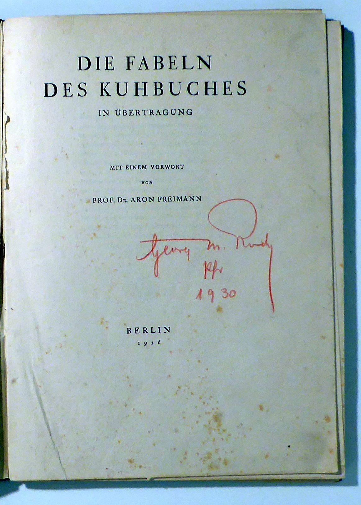 Mit einem Vorwort von Aron Freimann. Berlin: [Soncino Gesellschaft], 1926. XVI, 97 S., Einband: Blauer Pappband mit dem goldgeprägten Soncino-Signet. Format: 4°. Erstausgabe. Horodisch 1b. - Heider 1b. - Bürger/Sonder/Wallmeier 2. Im Februar des Jahres 1926 als "Beiheft" zur ersten Publikation der Soncino Gesellschaft, "Sefer Meschalim, genannt das Kuhbuch", wenige Monate davor anlässlich Chanukka erschienen. Der deutsche Text des Beiheftes wurde von Ruben Beatus in deutsche Reime gebracht und von Aron Freimann mit einem Vorwort versehen Breitrandiges Exemplar
