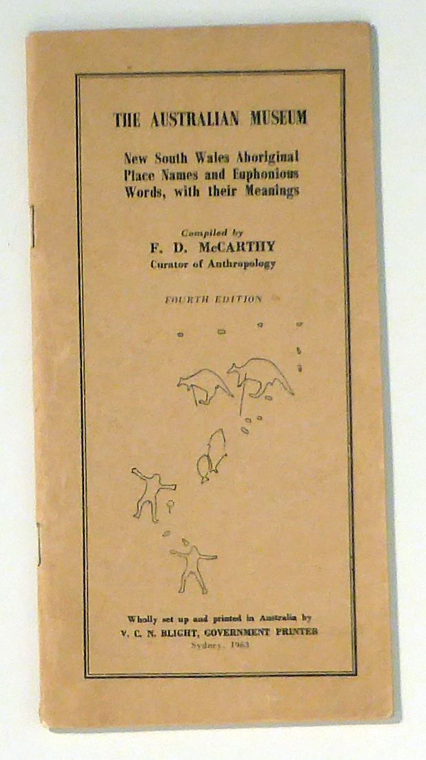Compiled by Frederick D. McCarthy. Fourth Edition. Sydney: The Australian Museum, 1963. 32 S., Einband: Original-Broschur, klammergeheftet. Format: 8°, schmalhoch. Verzeichnis der Wohngebiete von Aborigines in New South Wales (NSW, Australien) und eine Deutung deren Namen in englischer Sprache. Dazu eine Karte von NSW in der die Siedlungsgebiete eingetragen sind