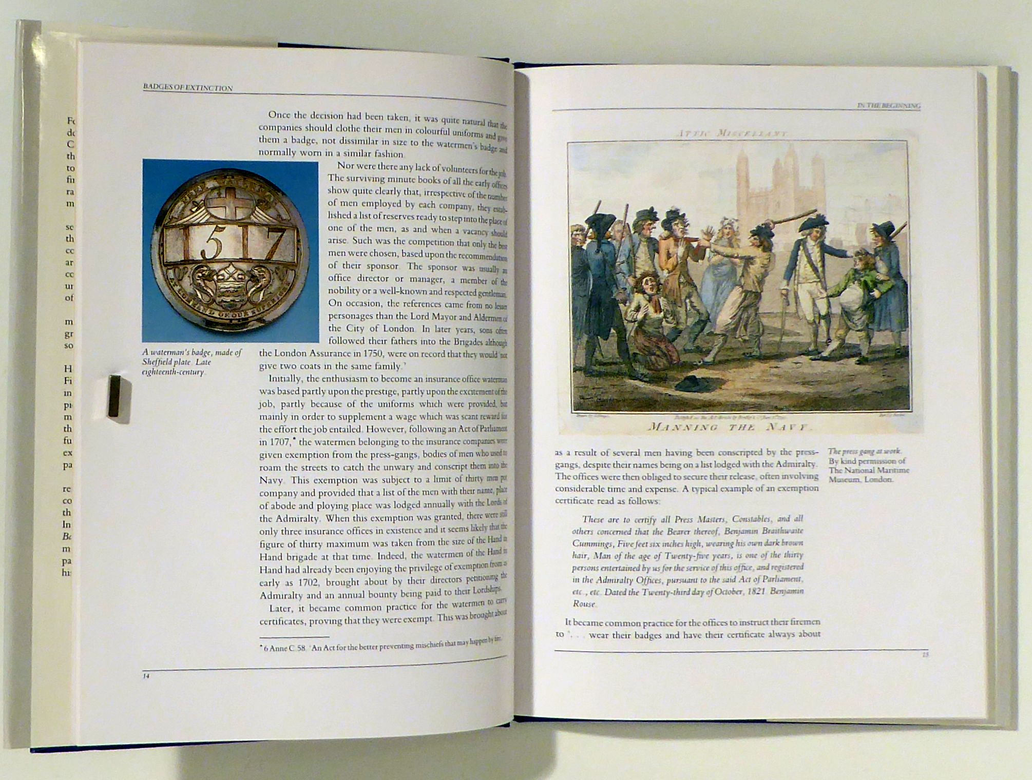 The Eighteenth and Nineteenth Century Badges of Insurance Office Firemen. London: Quiller Press, 1989. 104 S., mit zahlreichen meist farbigen Abbildungen. Einband: Original-Pappband. Format: gr.8°. Geschichte der im 18. und 19. Jahrhundert häufigen Medaillen und Marken für Feuerwehrmänner von Versicherungen