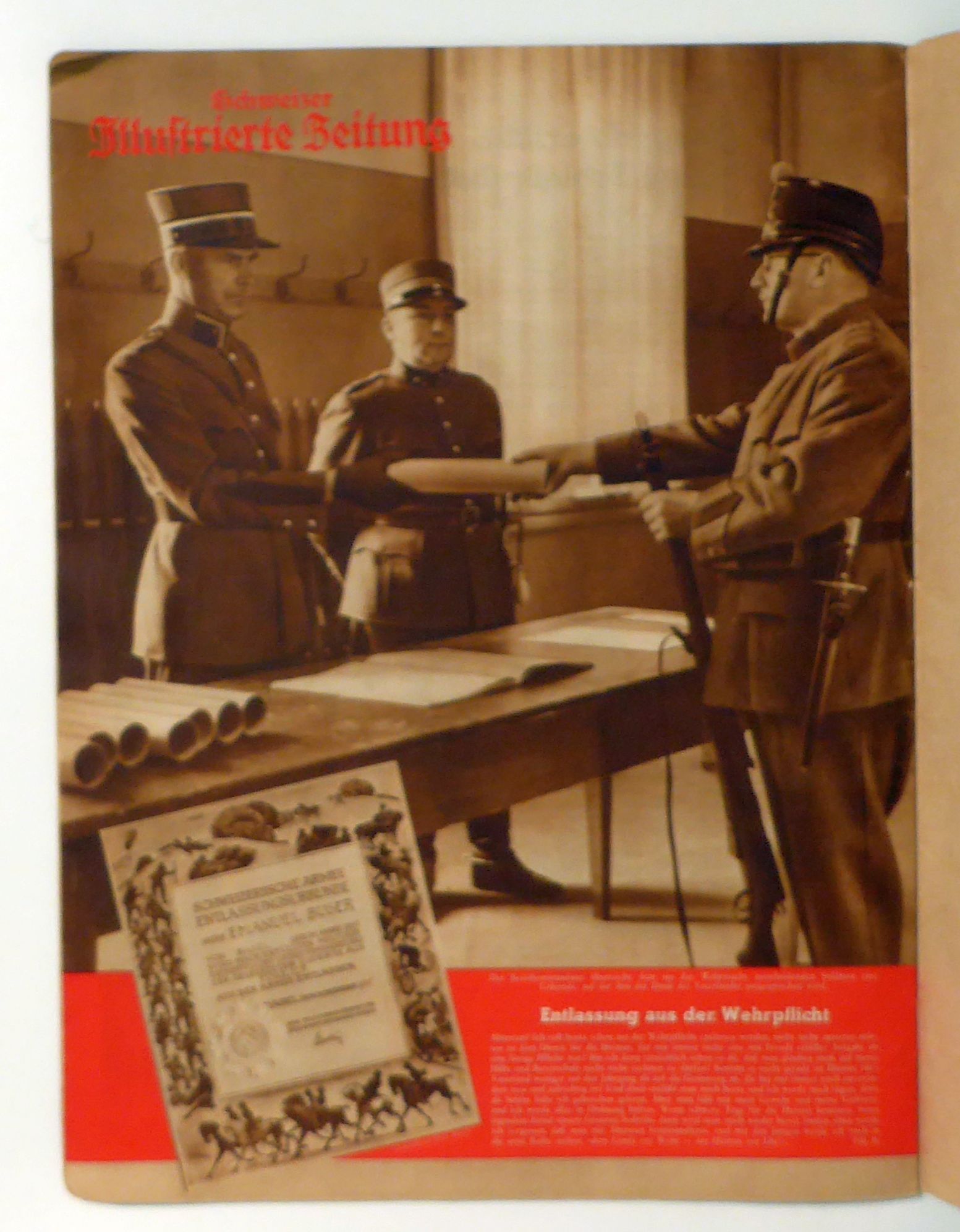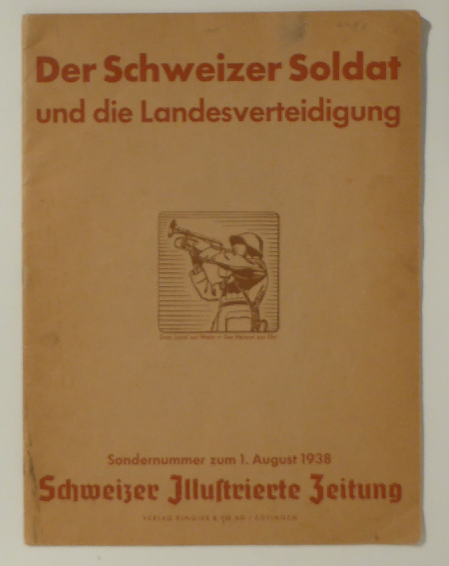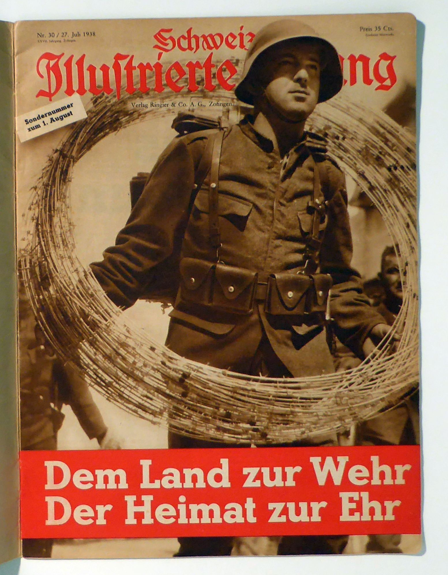 Sondernummer zum 1. August - Dem Land zur Wehr Der Heimat zur Ehr. Zofingen: Ringier, 1939. S. [935]-[966]; 31 S., Einband: Original-Broschur, klammergeheftet, mit zusätzlichem bedrucktem Kartonumschlag. Format: 4°. Reihe: Schweizer Illustrierte Zeitung, XXVII. Jahrgang, Nr. 30, 27. Juli 1938.